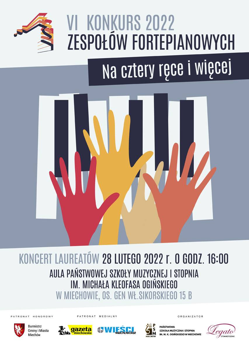 Zapraszamy pedagogów pianistów do udziału w VI Konkursie Zespołów Fortepianowych „Na cztery ręce i więcej”, którego organizatorem jest Państwowa Szkoła Muzyczna I stopnia im. Michała Kleofasa Ogińskiego w Miechowie oraz Stowarzyszenie Przyjaciół PSM I st. w Miechowie LEGATO.