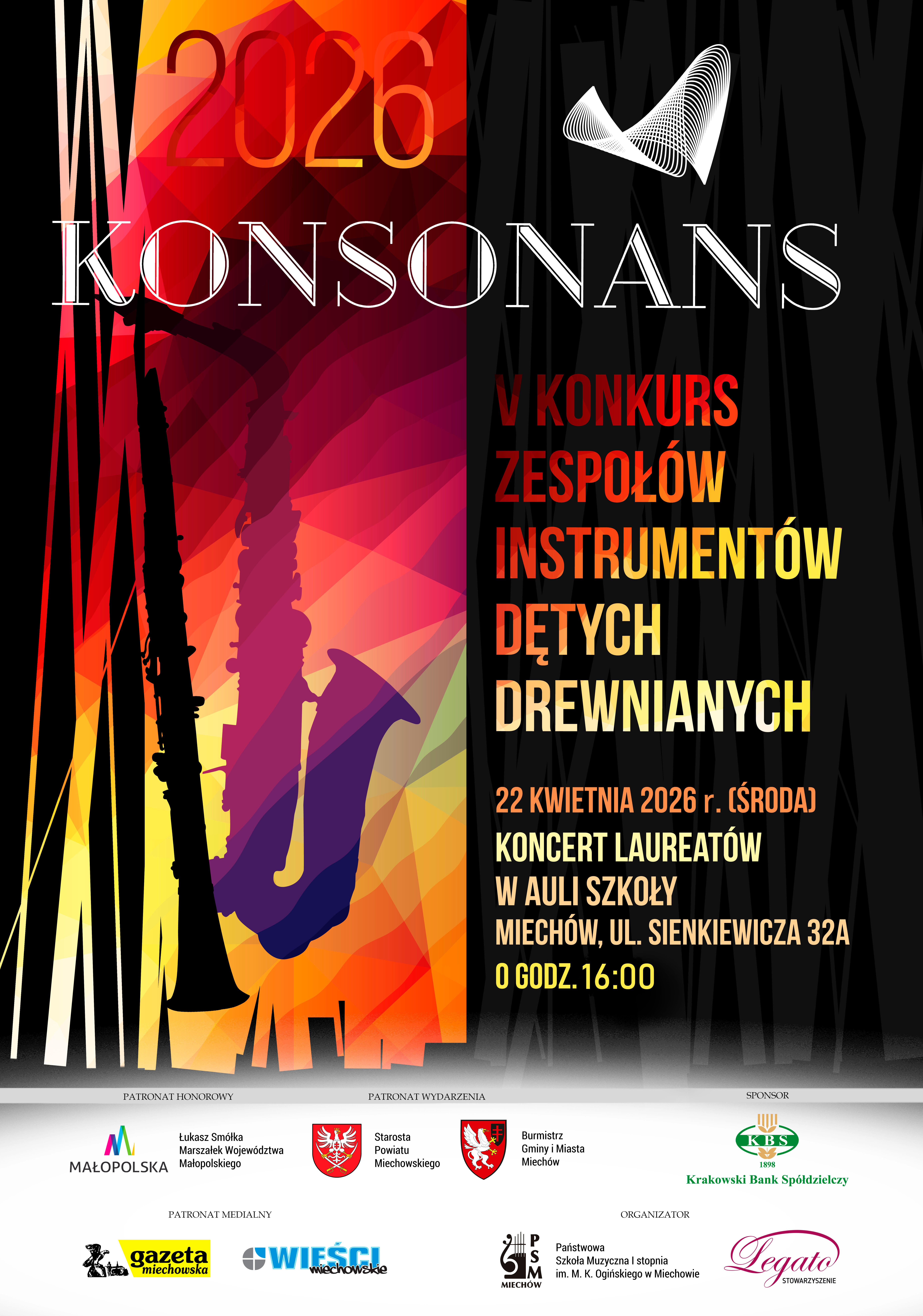 W imieniu Państwowej Szkoły Muzycznej I stopnia im. Michała Kleofasa Ogińskiego w Miechowie mam przyjemność zaprosić uczniów i pedagogów klas instrumentów dętych drewnianych szkół muzycznych I i II stopnia do udziału w V edycji Konkursu Zespołów Instrumentów Dętych Drewnianych „KONSONANS”.