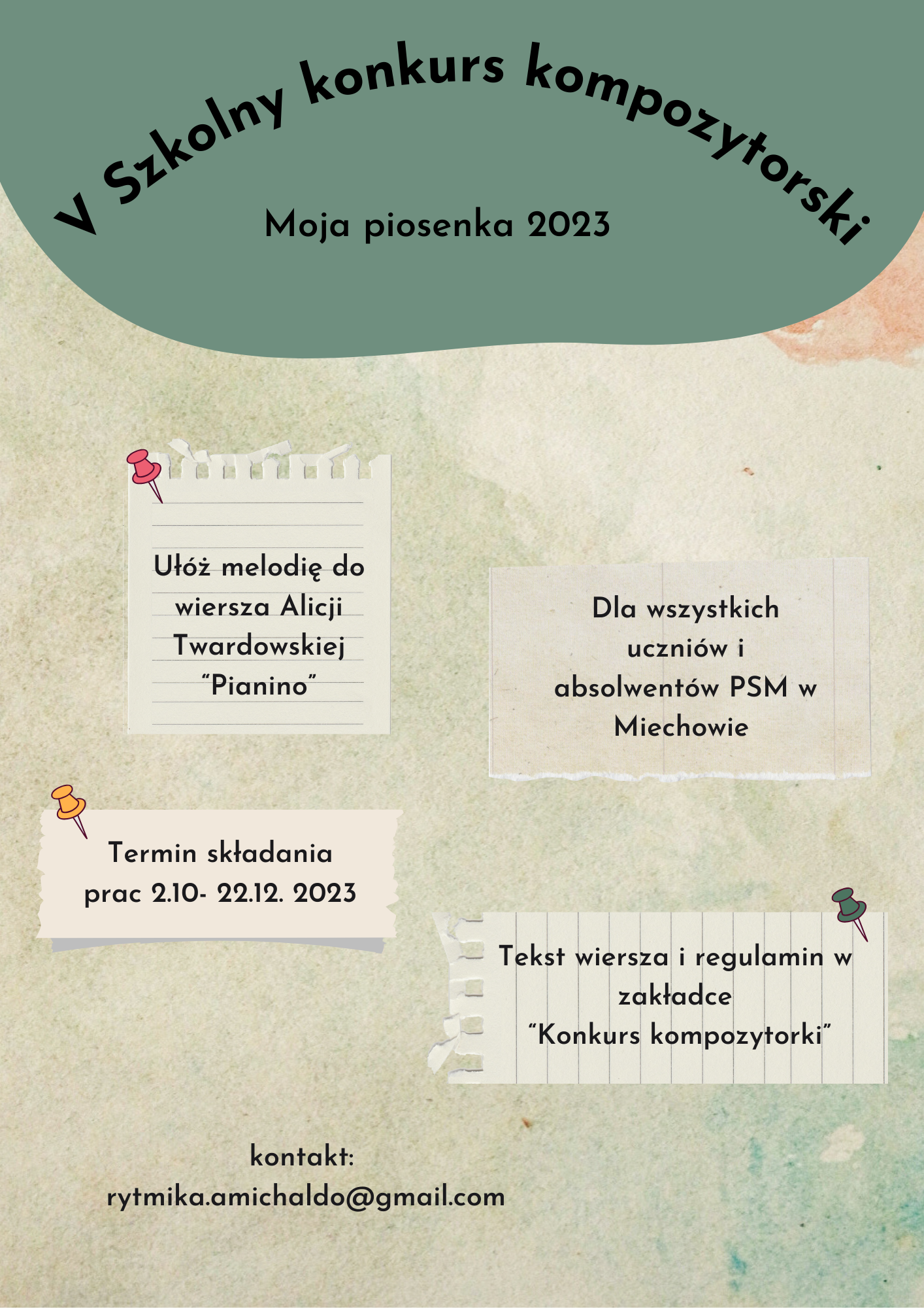 Jeśli potrafisz ułożyć melodię do wiersza, a nie umiesz jej zapisać – też możesz wziąć udział w konkursie – napisz do koordynatora konkursu na poniższy adres mailowy, a znajdziemy sposób, aby zapisać twoją kompozycję!