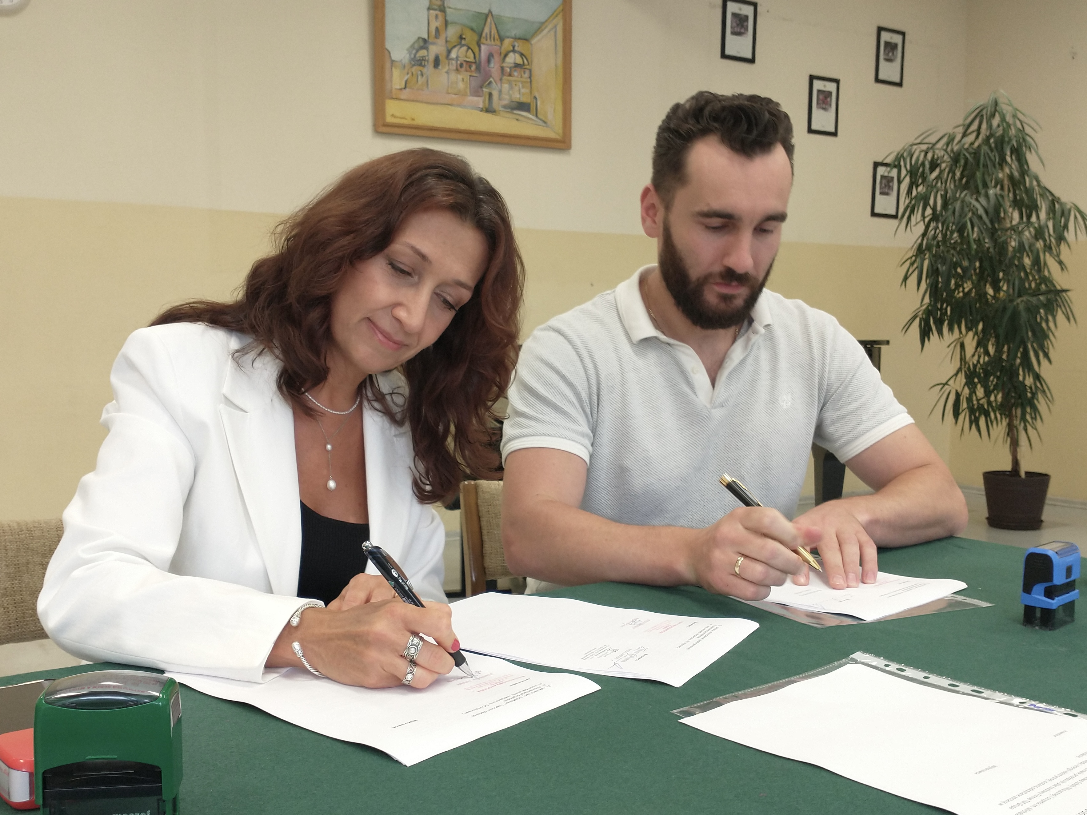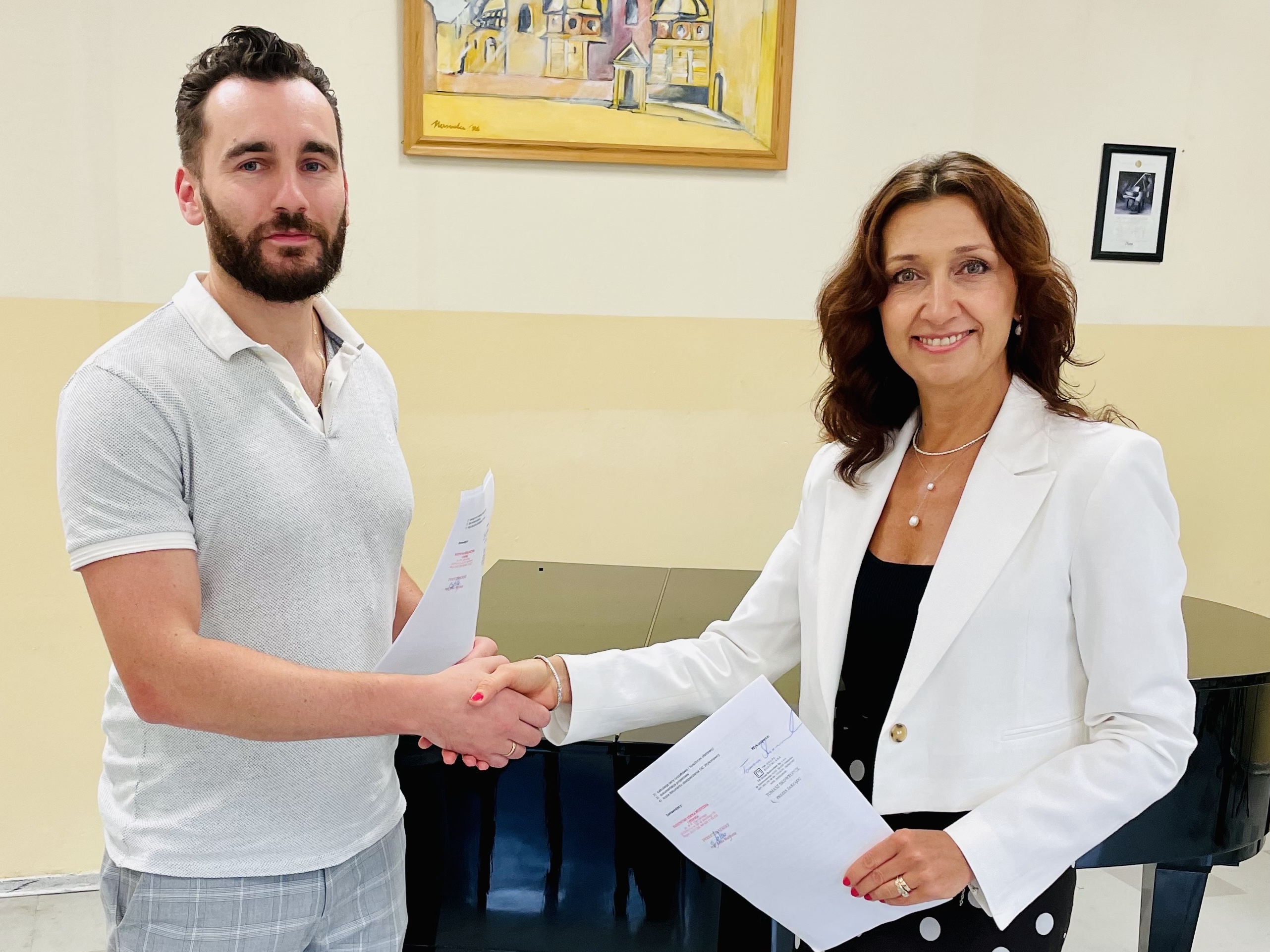 Na zdjęciach z momentu zawarcia kontraktu: Dyrektor Szkoły Anna Macheta i Prezes Zarządu firmy TM Grupa Budowlana Tomasz Skowronek.