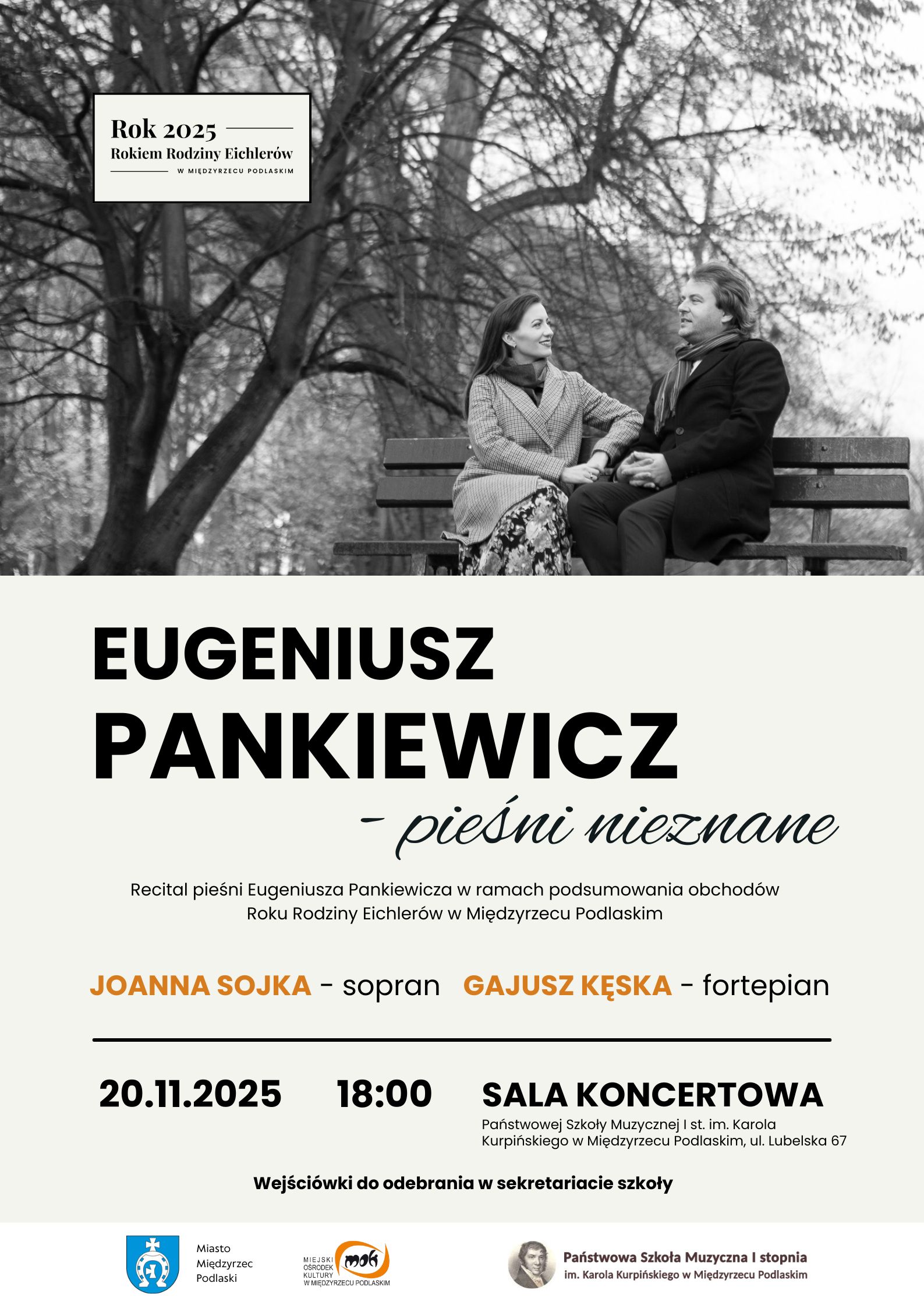 Zapraszamy na recital wybranych pieśni Eugeniusza Pankiewicza w wykonaniu zespołu Classic Duo, który tworzą artyści z Krakowa: Joanna Sojka (sopran) oraz Gajusz Kęska (fortepian). Koncert odbędzie się 20 listopada 2025 r. (czwartek) o godz. 18.00 w sali koncertowej Państwowej Szkoły Muzycznej I stopnia im. K. Kurpińskiego w Międzyrzecu Podlaskim przy ul. Lubelskiej 67 w ramach cyklu wydarzeń związanych z obchodami Roku Rodziny Eichlerów.