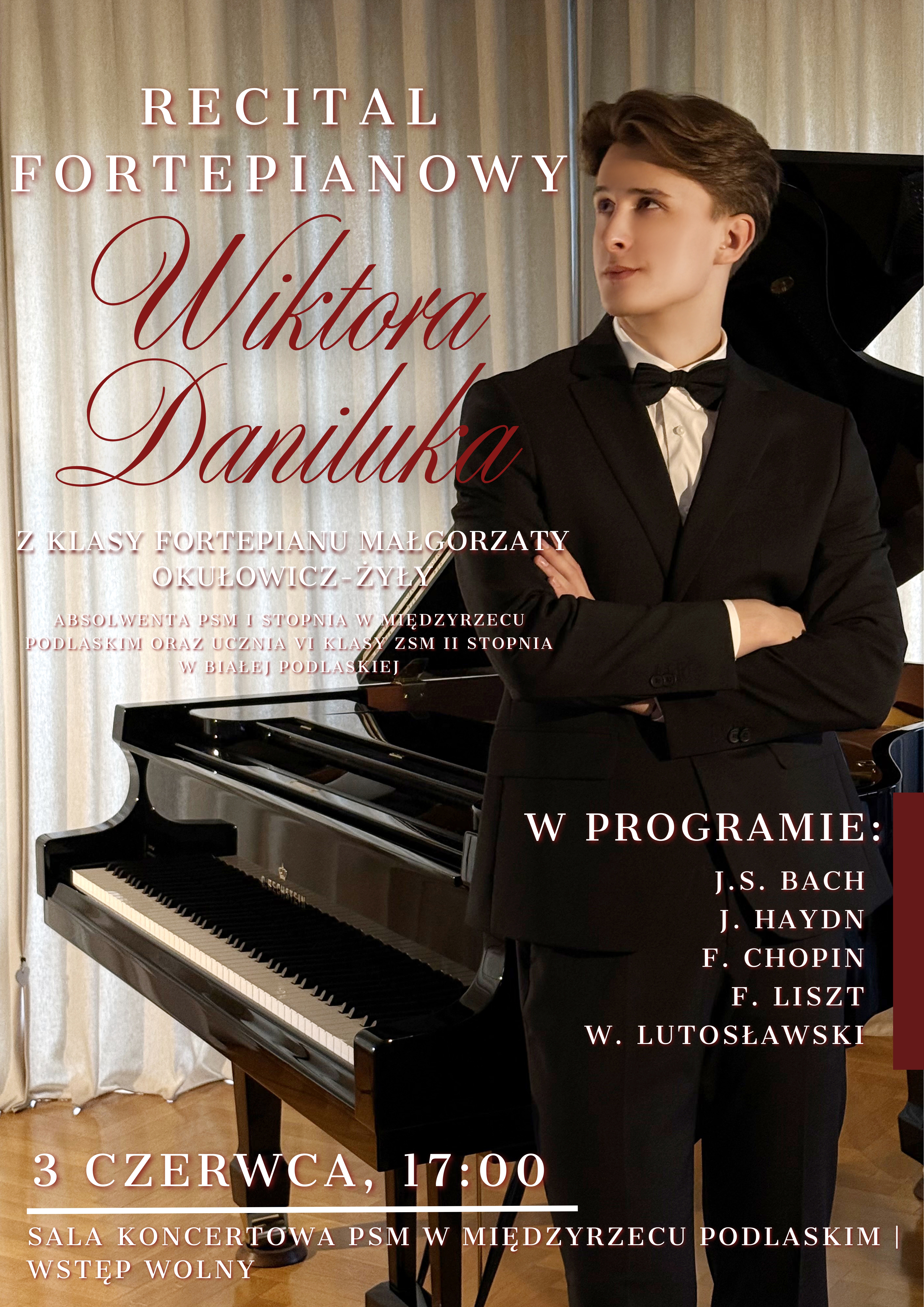 3 czerwca 2025 w sali koncertowej Państwowej Szkoły Muzycznej I st. im. K. Kurpińskiego w Międzyrzecu Podlaskim odbył się recital fortepianowy Wiktora Daniluka - absolwenta naszej szkoły oraz ucznia VI klasy Państwowej Szkoły Muzycznej II st. im. F. Chopina w Białej Podlaskiej. Podczas koncertu Wiktor wykonał program przygotowywany na egzamin dyplomowy.