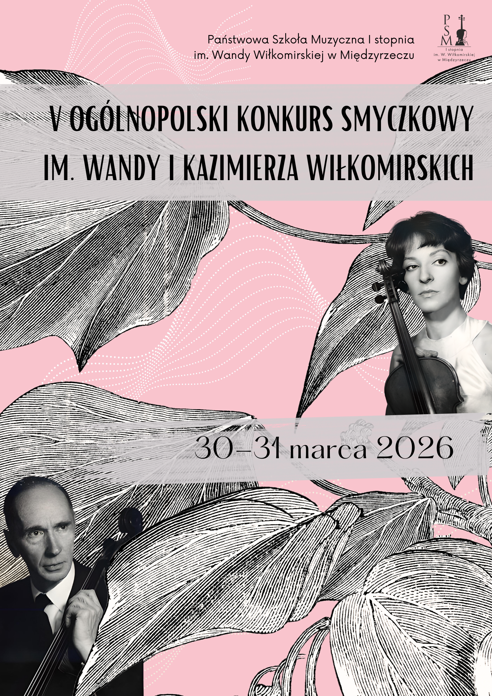 Baner promujący V Ogólnopolski Konkurs Smyczkowy im. Wandy i Kazimierza Wiłkomirskich, który odbędzie się w dniach 30-31 marca 2026 roku. Na różowym tle z białymi kropkami widnieje nazwa konkursu napisana czarną, elegancką czcionką. Po lewej stronie znajdują się czarno-białe zdjęcia portretowe Wandy i Kazimierza Wiłkomirskich. W prawym górnym rogu jest logo Państwowej Szkoły Muzycznej I stopnia im. W. Wiłkomirskiej w Międzyrzeczu, a obok niego wizerunek ryby ze skrzydłami.
