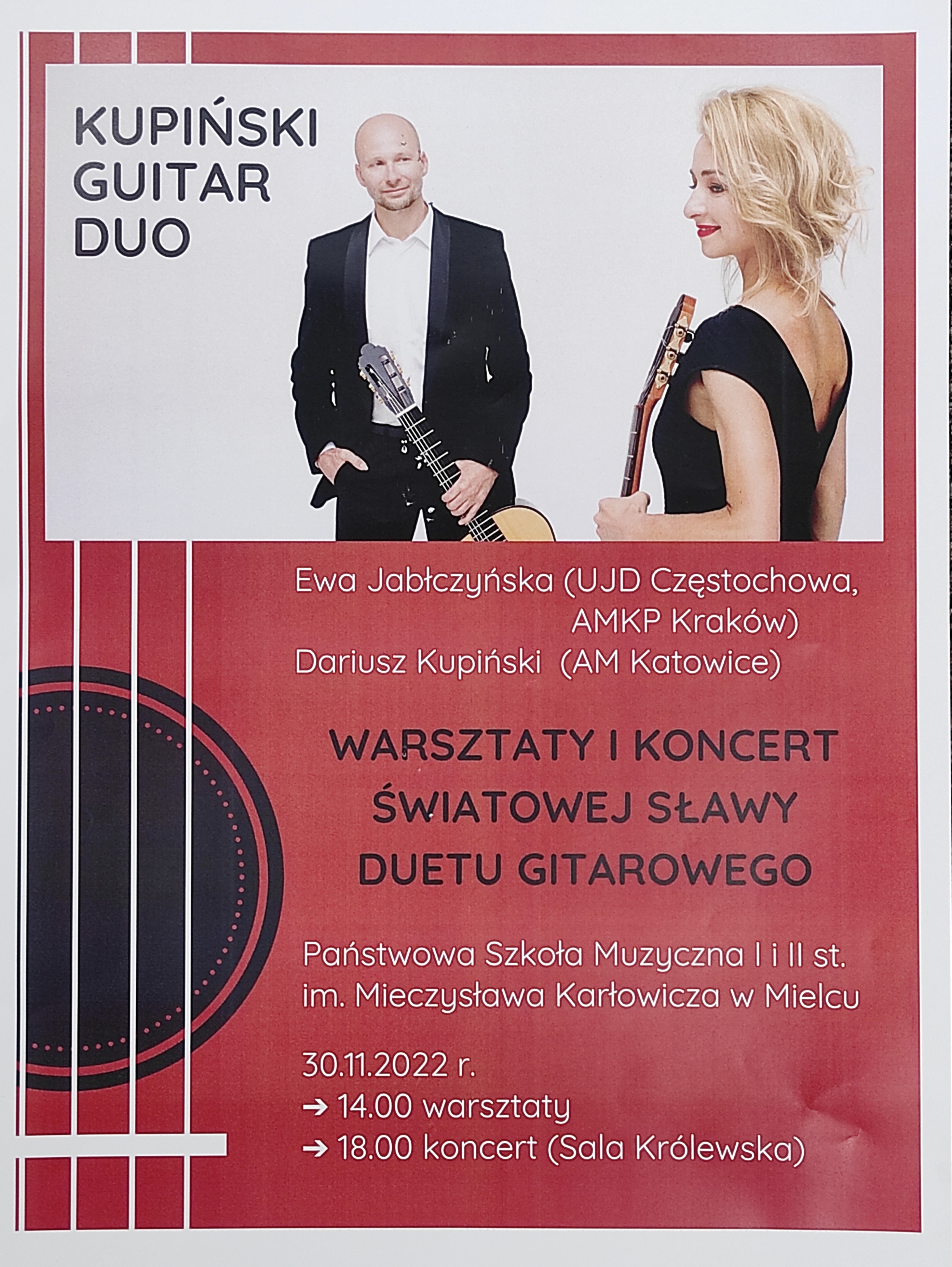 Zapraszamy na warsztaty dla uczniów i nauczycieli gitary, początek godz. 14:00, które poprowadzą: dr hab. Ewa Jabłczyńska AM Kraków oraz dr Dariusz Kupiński AM Katowice