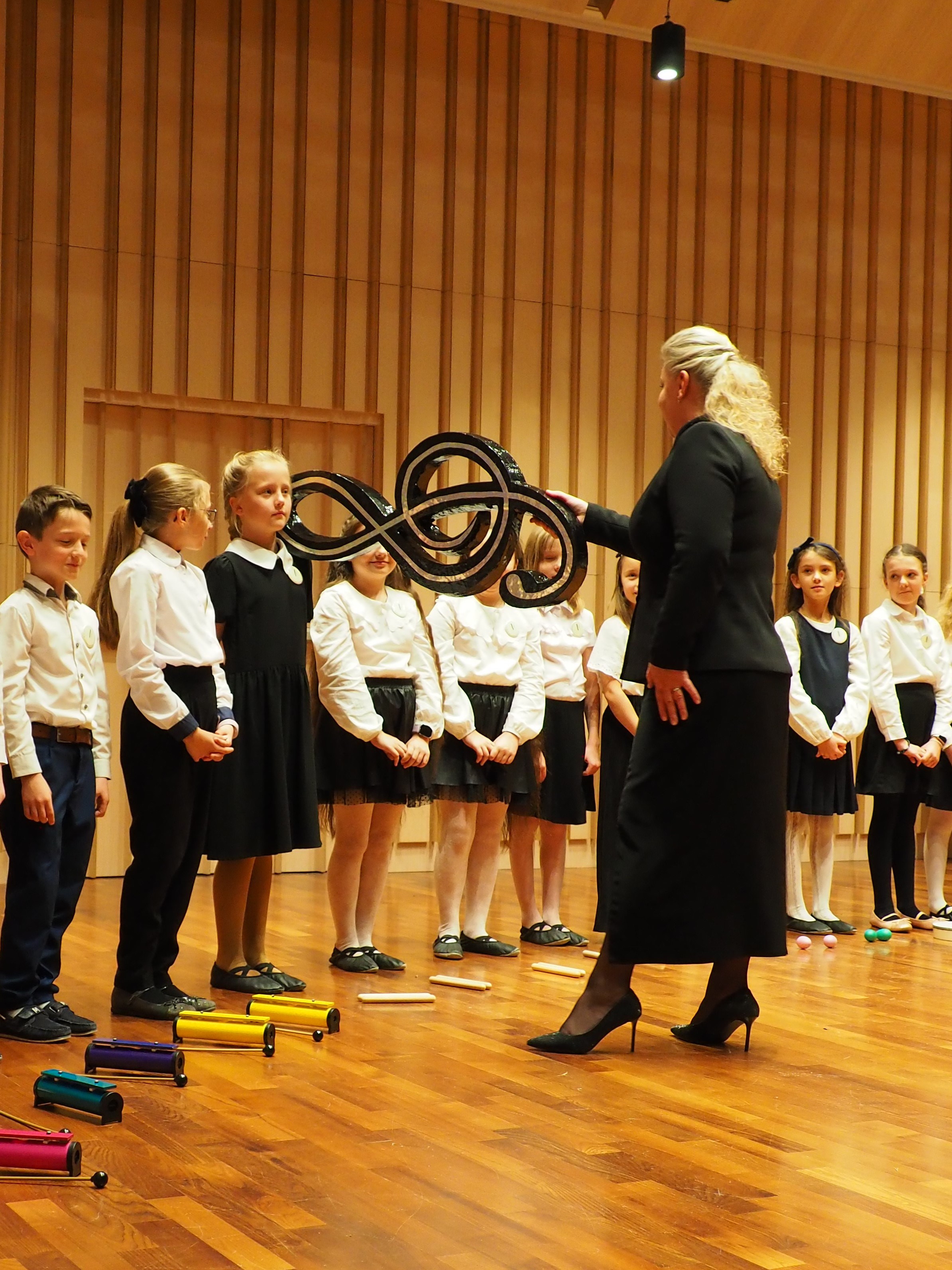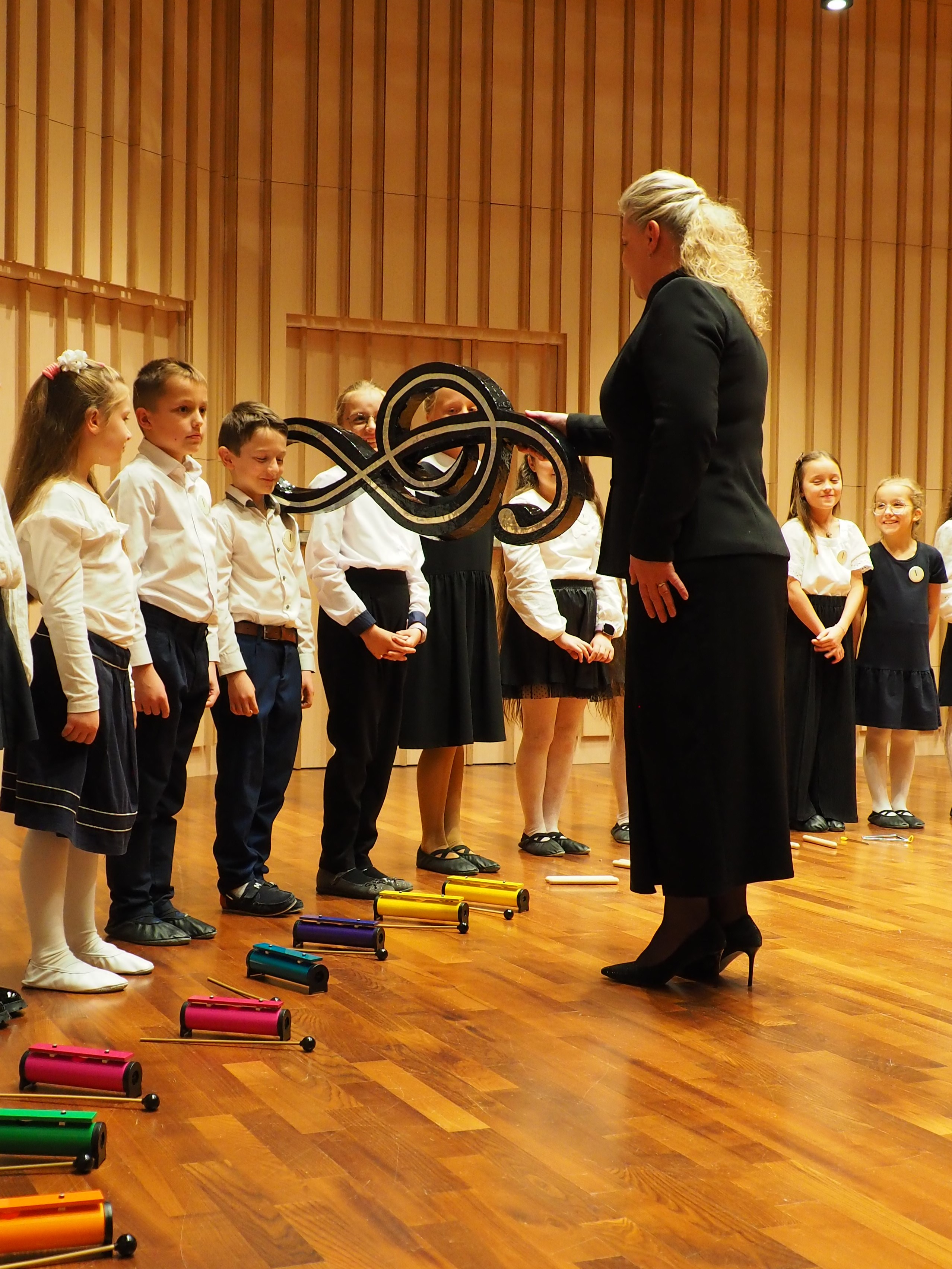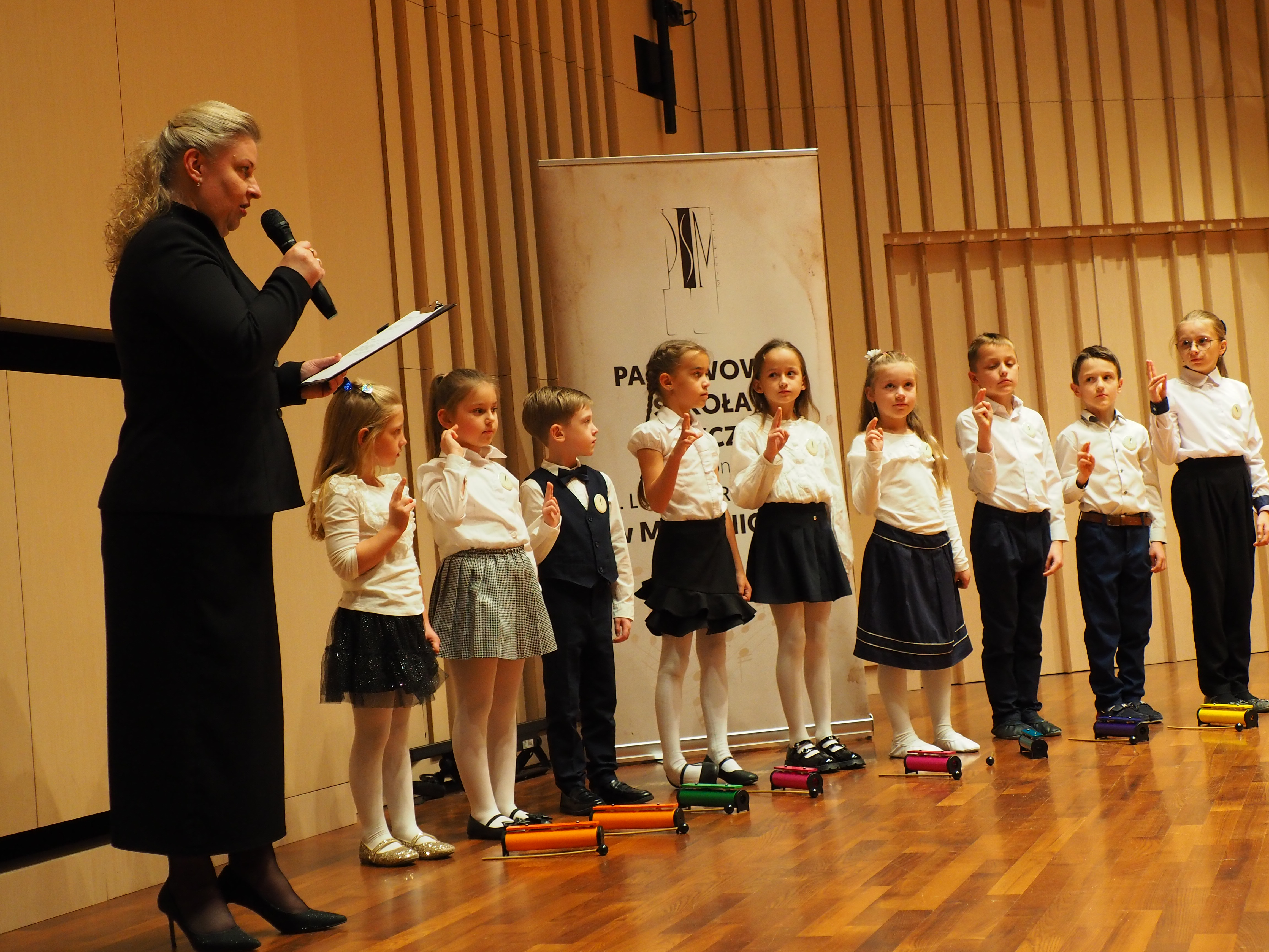 Pierwszoklasiści złożyli przyrzeczenie, że będą się pilnie uczyli oraz wypełniali wszystkie obowiązki i zadania ucznia, a także dbali o instrumenty muzyczne i sprzęt szkolny. Dyrektor szkoły p. Jolanta Antkiewicz tradycyjnie pasowała pierwszoklasistów kluczem wiolinowym na uczniów szkoły i życzyła im, aby w szkole muzycznej znaleźli przyjaciół. Słowa wsparcia uczniowie klas pierwszych usłyszeli także od Samorządu Uczniowskiego. Urszula i Franciszek przywitali zebranych, złożyli serdeczne życzenia oraz zaoferowali pierwszakom swoją wszechstronną pomoc.