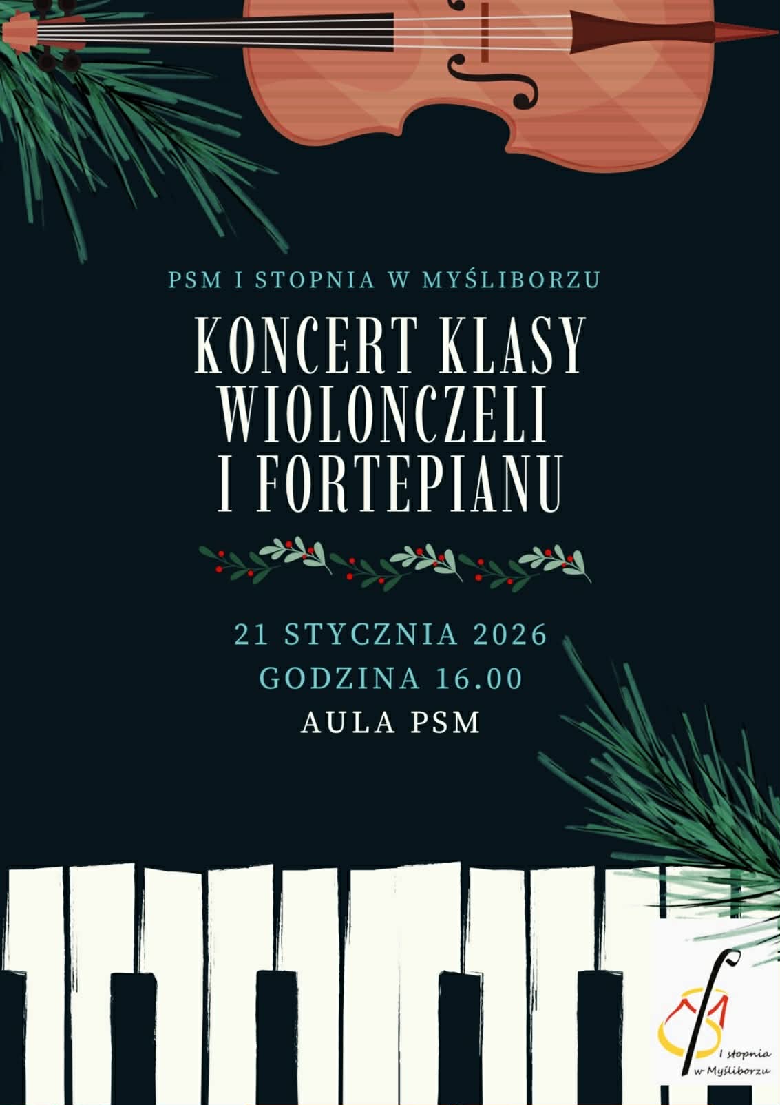 Serdecznie zapraszamy na popis uczniów klas: wilonczeli i fortepianu.