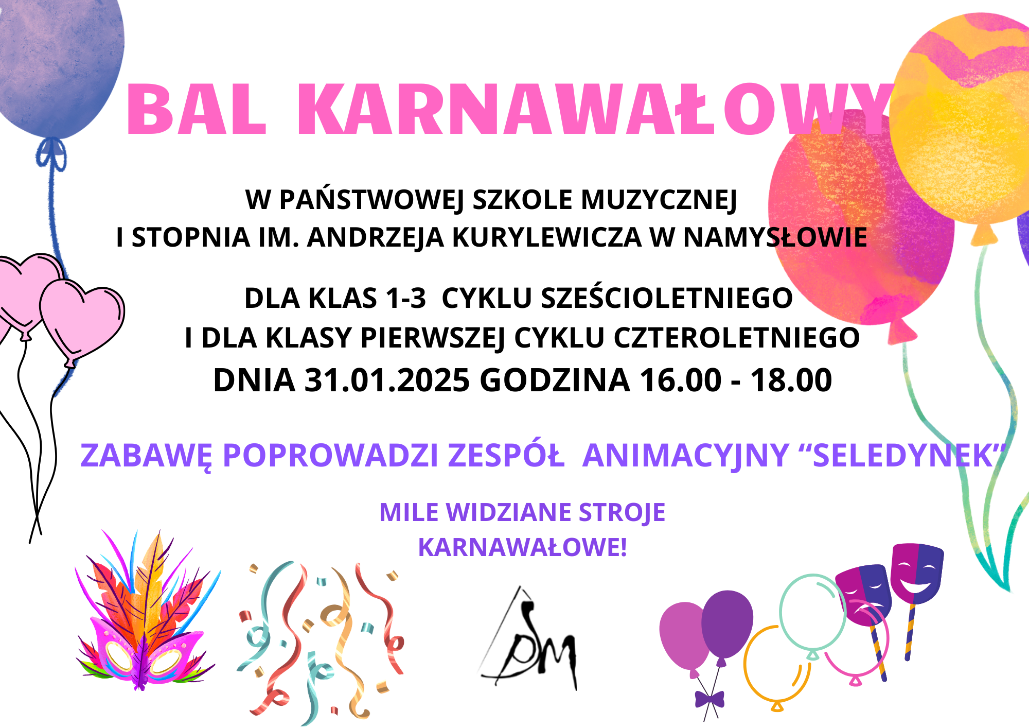 Zapraszamy na BAL KARNAWAŁOWY, który odbędzie się 31.01.2025 r. o godzinie 16.00. Zabawę poprowadzi zespół animacyjny "SELEDYNEK".