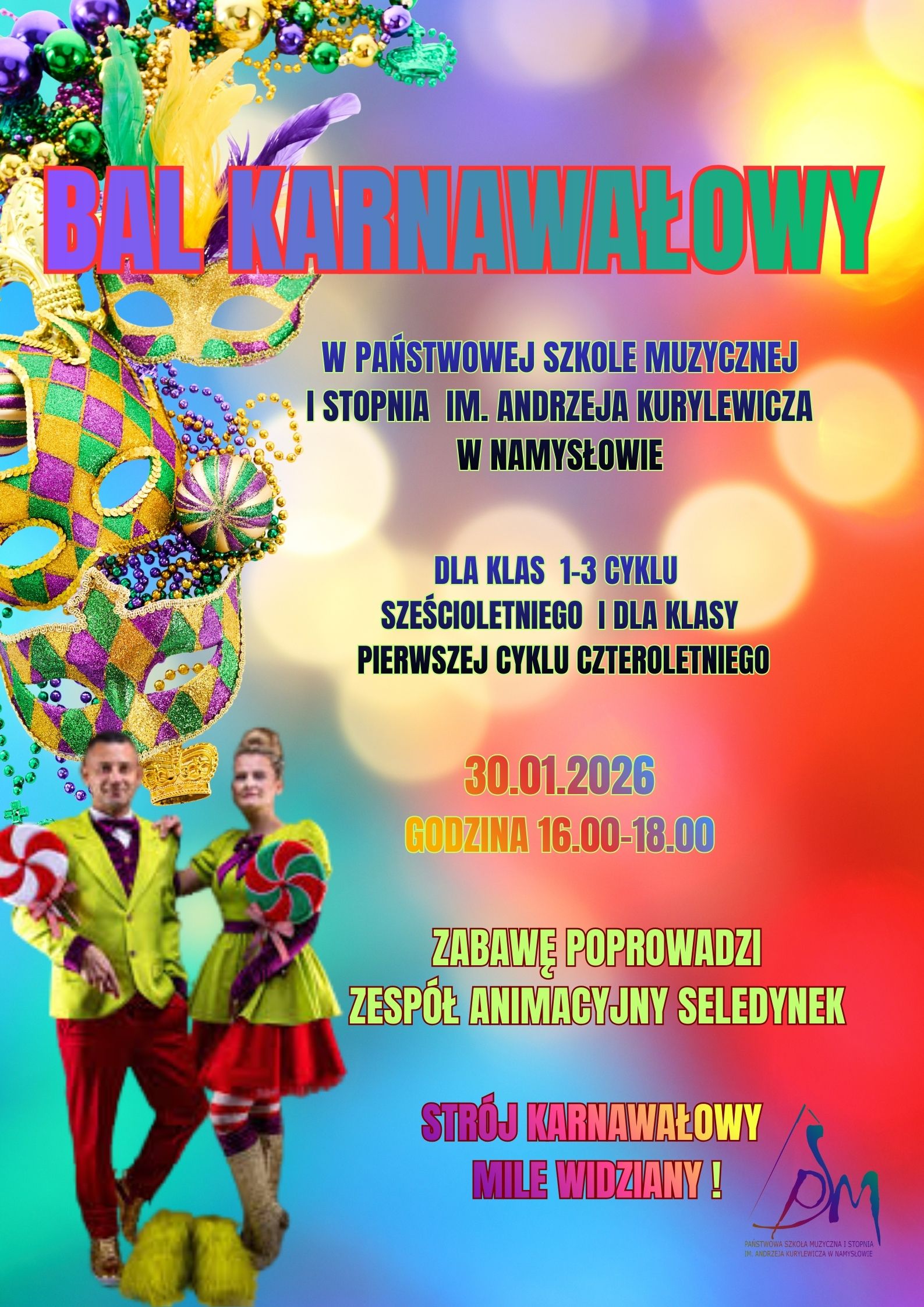 Zapraszamy uczniów klas I - III cyklu sześcioletniego oraz uczniów klasy pierwszej cyklu czteroletniego na Bal Karnawałowy, który odbędzie się 30 stycznia 2026 r. godz. 16:00. Strój karnawałowy mile widziany!