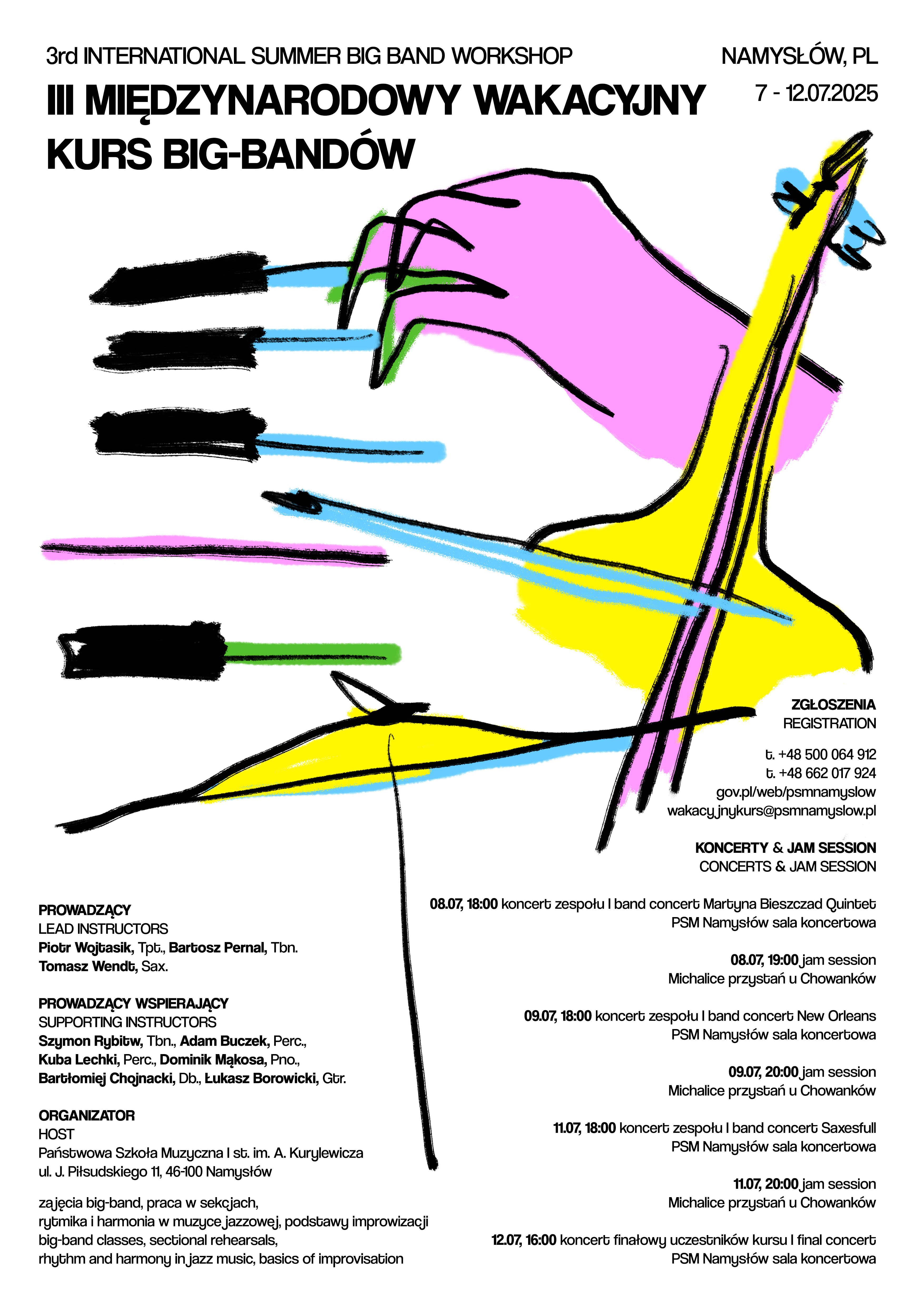 7-12.07.2025 r. III MIĘDZYNARODOWY WAKACYJNY KURS BIG-BANDÓW organizowany jest dla studentów i uczniów szkół muzycznych: klas saksofonu, trąbki, puzonu i instrumentów sekcji rytmicznej (fortepian, kontrabas, gitara basowa, gitara elektryczna, perkusja).