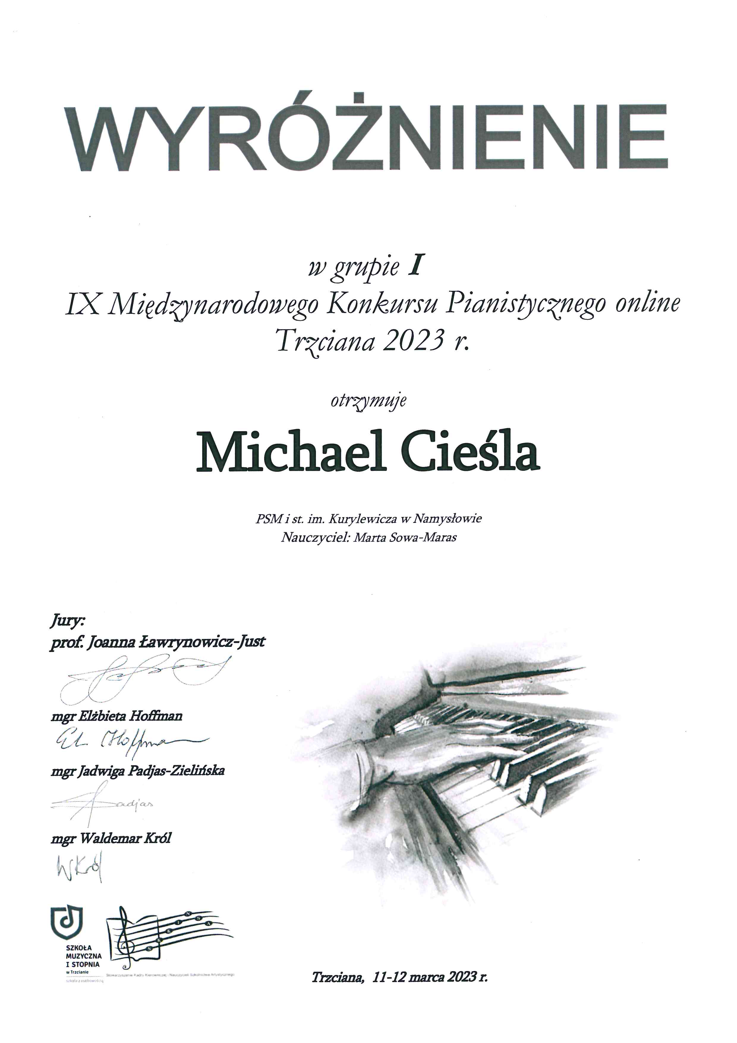 Wyróżnienie dla Michaela Cieśla, ucznia Pani Marty Sowa-Maras w IX Międzynarodowym Konkursie pianistycznym online Trzciana 2023 r.