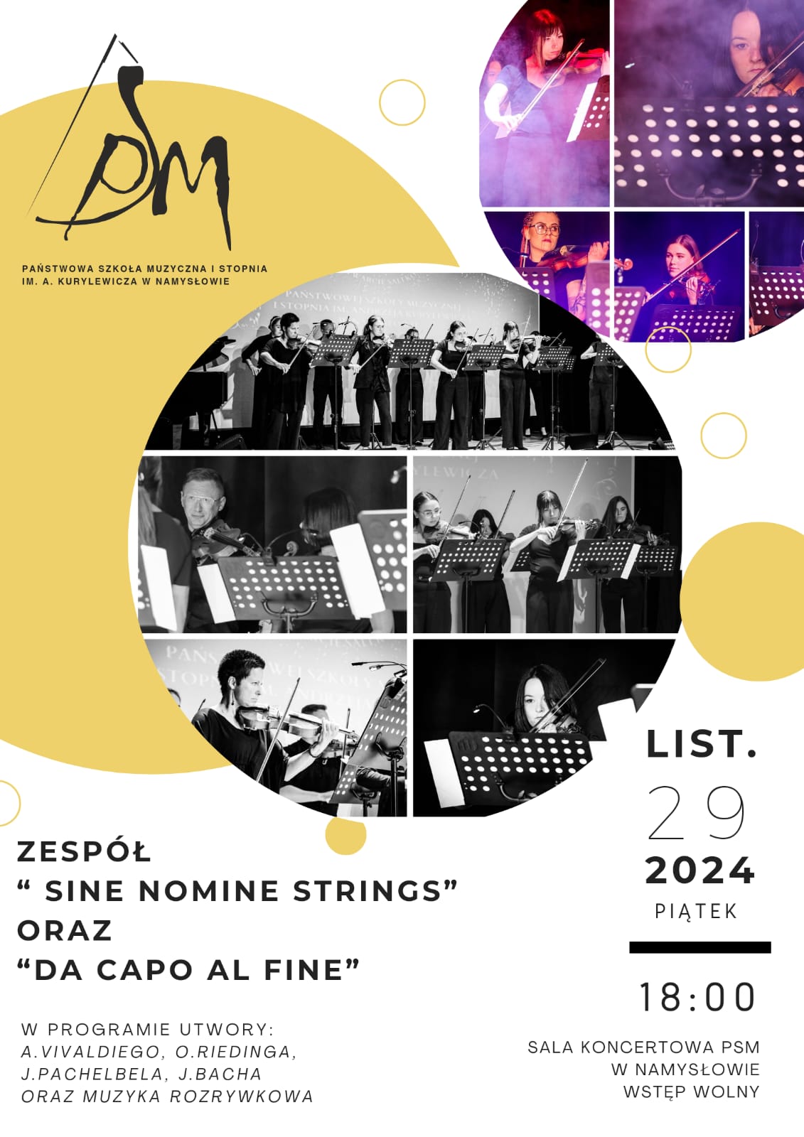 Dnia 29 listopada 2024r o godzinie 18.00 w sali koncertowej odbędzie się koncert skrzypcowy zespołów "SINE NOMINE STRINGS" oraz " DA CAPO AL FINE" WSTĘP WOLNY