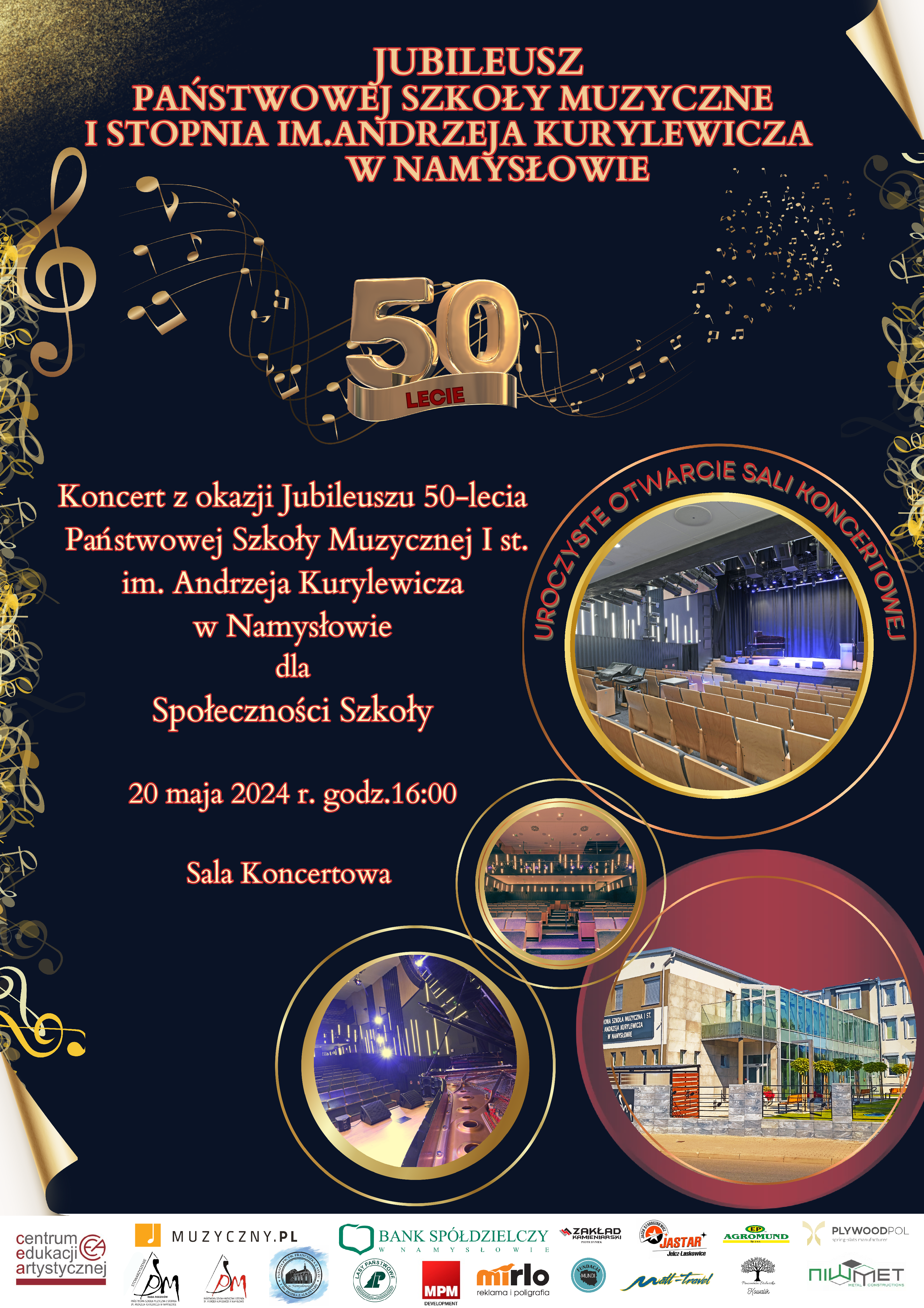 Z okazji jubileuszu 50-lecia szkoły zapraszamy całą społeczność szkoły na koncert, który odbędzie się 20 maja 2024 r. (poniedziałek) w sali koncertowej.
