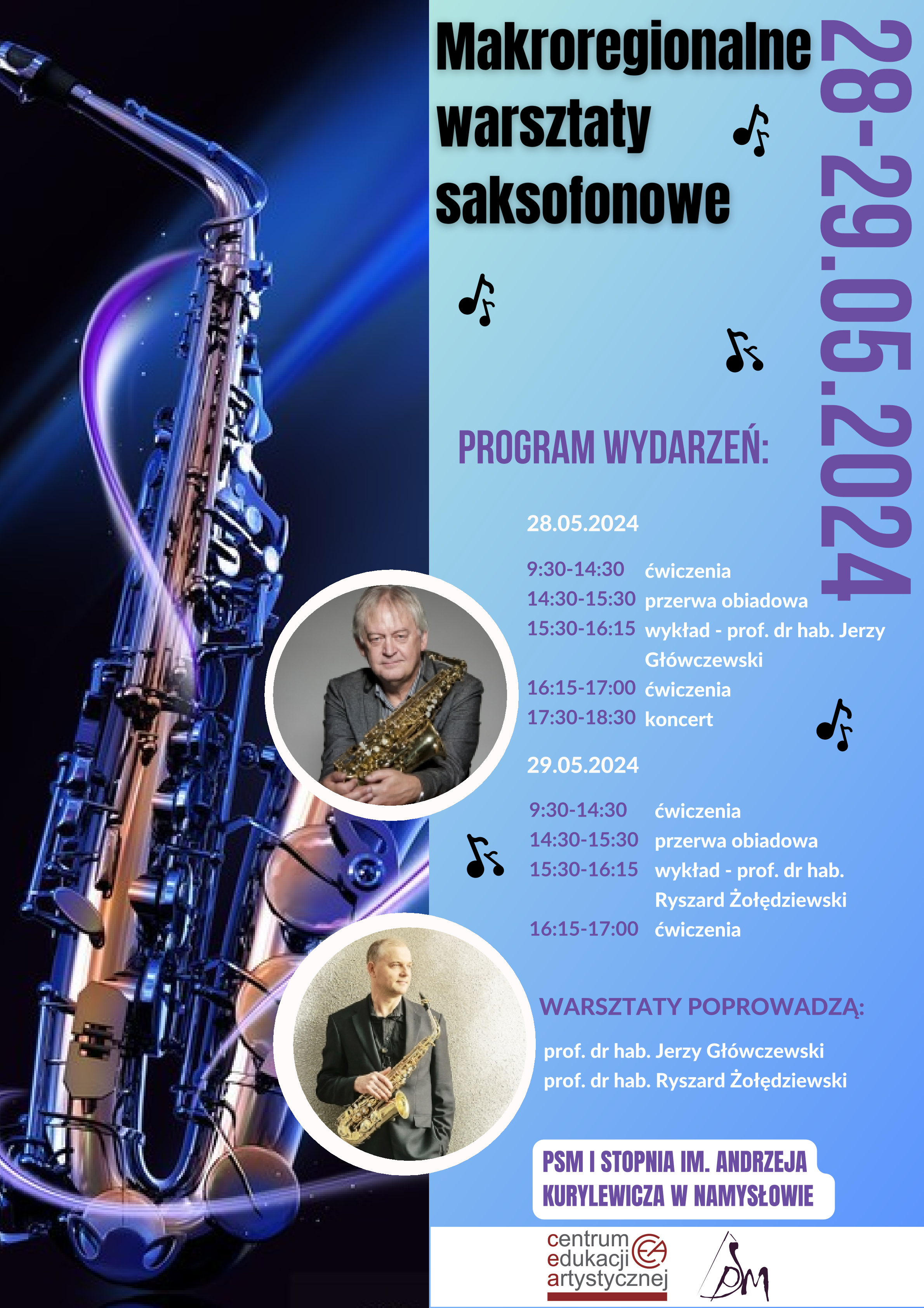 28 - 29 maja 2024 r. PSM I st. im. Andrzeja Kurylewicza w Namysłowie MAKROREGIONALNE WARSZTATY DLA NAUCZYCIELI KLAS SAKSOFONU REGIONU OPOLSKIEGO I DOLNOŚLĄSKIEGO