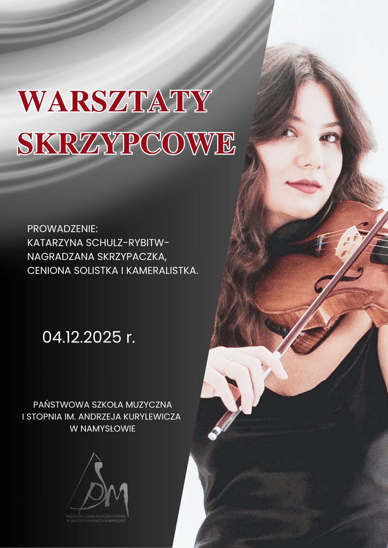 Informujemy, że 4 grudnia 2025 roku, w czwartek odbędą się warsztaty skrzypcowe, które poprowadzi Katarzyna Schulz-Rybitw nagradzana skrzypaczka, ceniona solistka i kameralistka. Warsztaty odbędą się w sali koncertowej Państwowej Szkoły Muzycznej I stopnia im. Andrzeja Kurylewicza w Namysłowie.