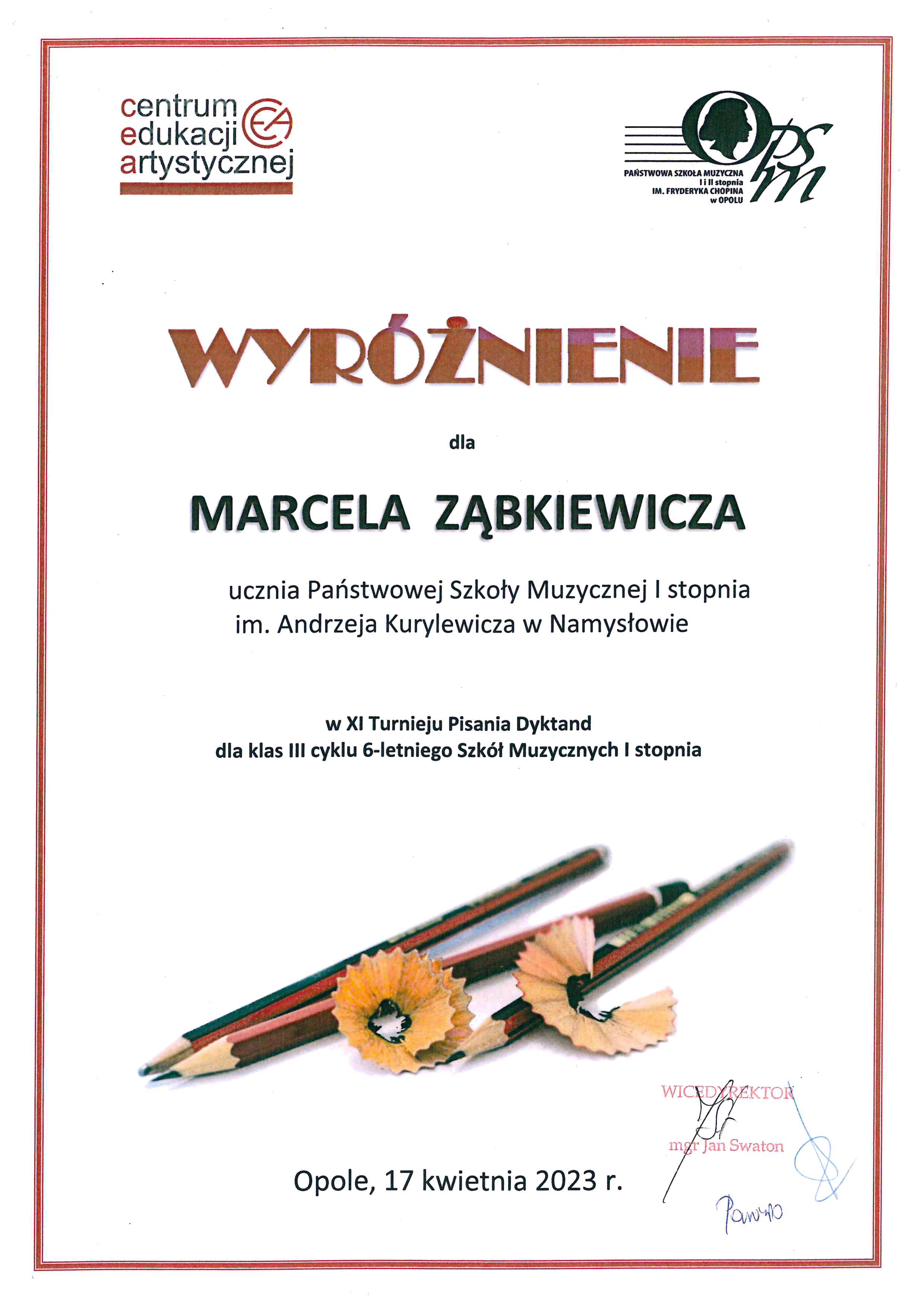 - Wyrożnienie oraz dyplom uczestnictwa dla Marcela Ząbkiewicza ucznia Pana Adama Treli
