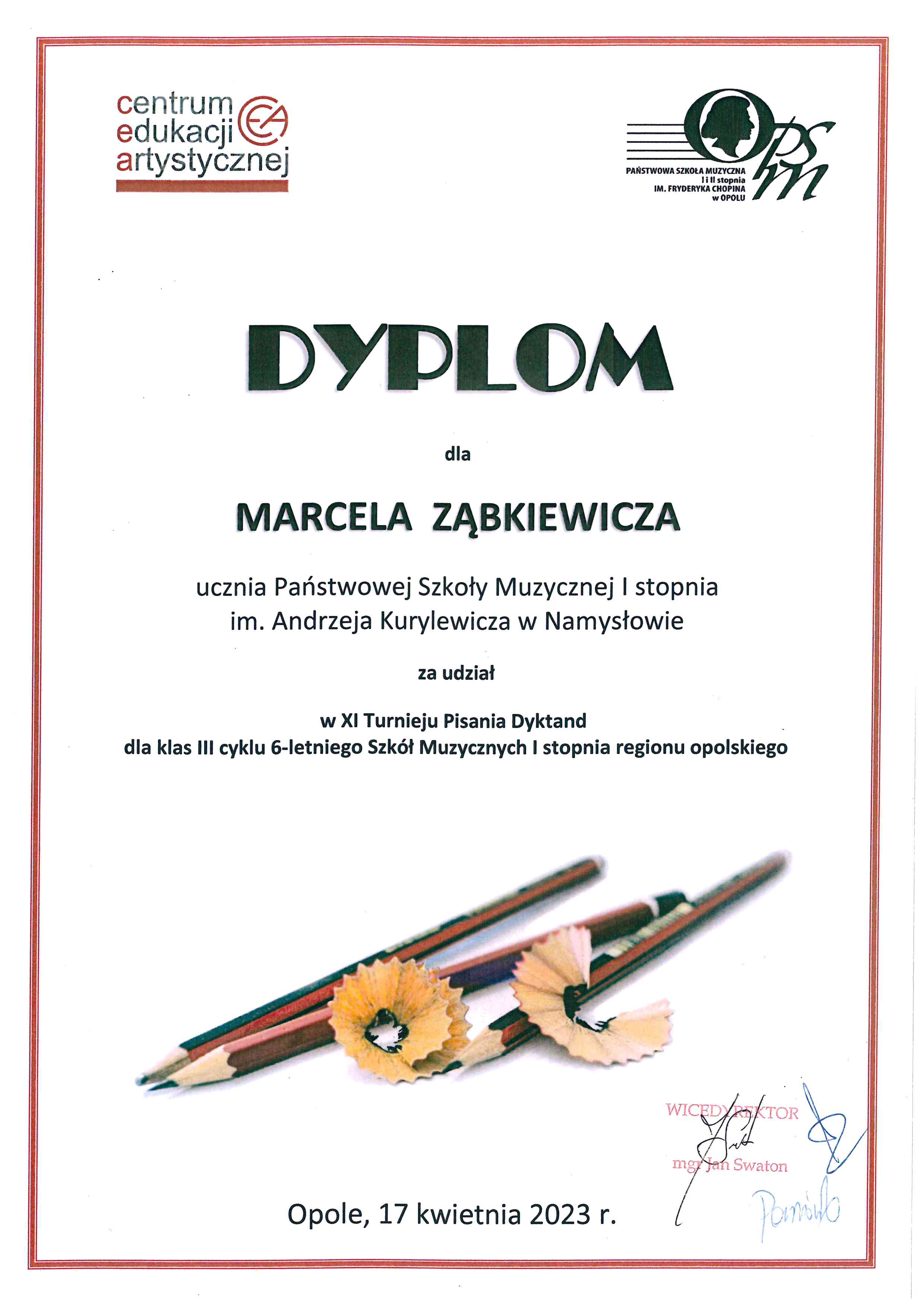- Dyplom uczestnictwa dla Gabrieli Dłubak uczennicy Pana Zbigniewa Szporka