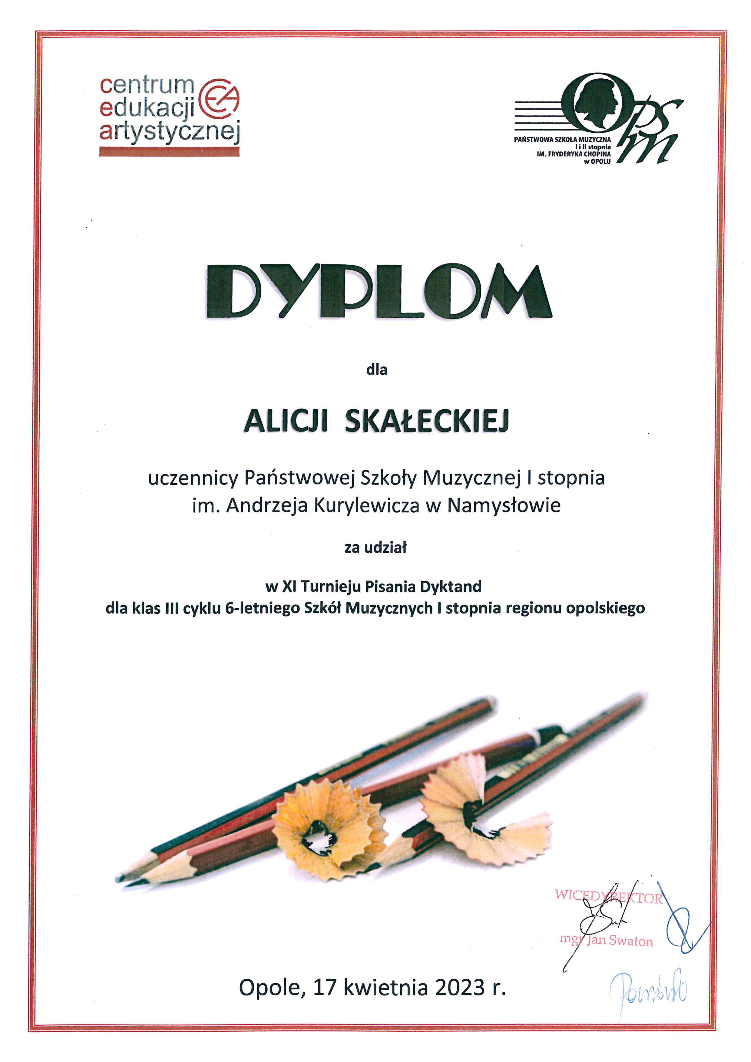 - Dyplom uczestnictwa dla Alicji Skałeckiej uczennicy Pani Karoliny Drozd