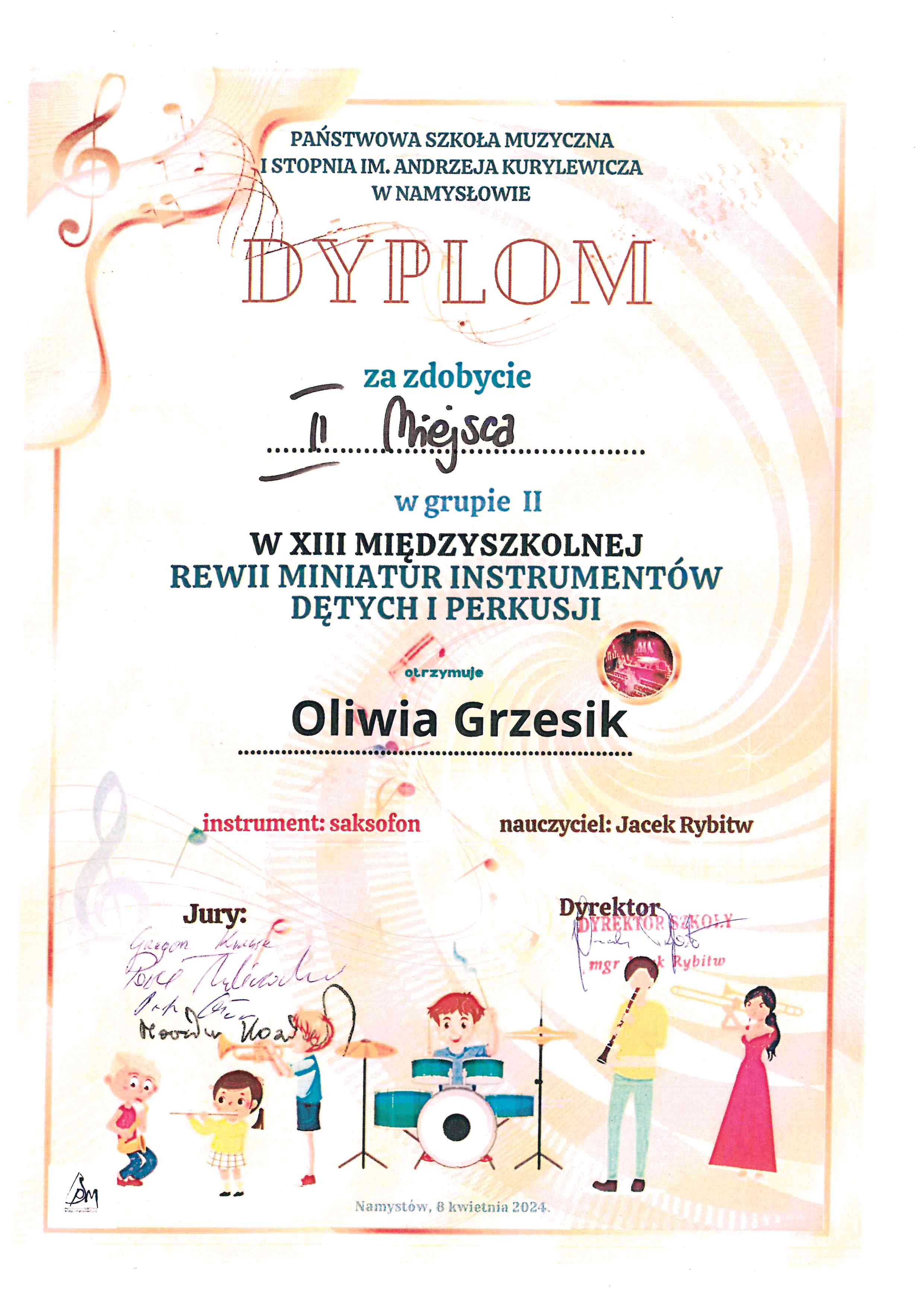 Osiągnięcia naszych uczniów w XIII Międzyszkolnej Rewii Miniatur Instrumentów Dętych i Perkusji 8 kwietnia 2024 Namysłów