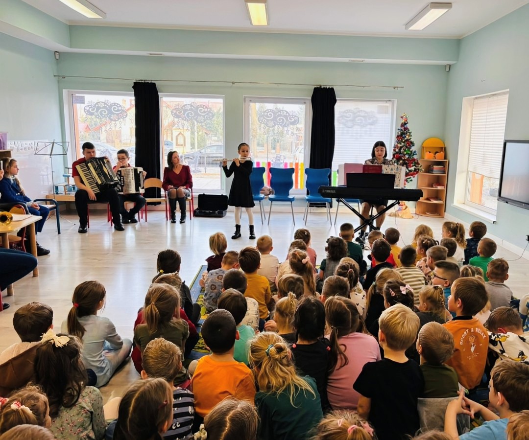 Przedszkolaki z Zespołu Szkolno – Przedszkolnego w Otyniu miały okazję uczestniczyć w wyjątkowym koncercie kolęd w wykonaniu uczniów szkoły muzycznej. Tuż przed świętami, 17 grudnia młodzi muzycy zaprezentowali znane kolędy i melodie świąteczne, grając na różnych instrumentach, a także śpiewając. Występ wprowadził dzieci w radosny, świąteczny nastrój, zachwycił małych słuchaczy i był miłym spotkaniem z muzyką oraz bożonarodzeniową tradycją. Występ zakończył się wspólnym wykonaniem kolędy „Przybieżeli do Betlejem” z towarzyszeniem akompaniamentu Pani Taisii Serafimovej, przy którym wszyscy połączyli swoje głosy. To była wielka radość usłyszeć jak przedszkolaki pięknie i z radością śpiewają kolędę! Podczas koncertu wystąpili Helena Domagała (trąbka), Michalina Świdzińska (flet poprzeczny), akordeoniści Jakub Krajewski i Wojtek Ficner oraz duet fortepianowy w składzie Joanna Kalbarczyk i Taisiia Serfimova. Koncert prowadziła Joanna Kalbarczyk.