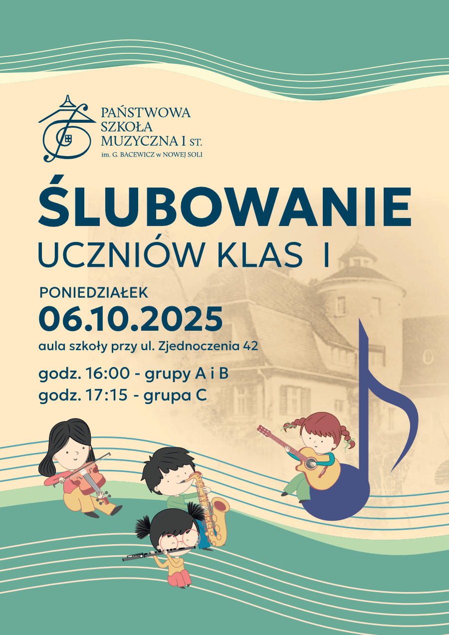 Zapraszamy na uroczyste ślubowanie uczniów klasy pierwszej, które odbędzie się na auli szkoły przy ul. Zjednoczenia 42 w dniu 6 października 2025 r. Szczegóły na załączonym plakacie.