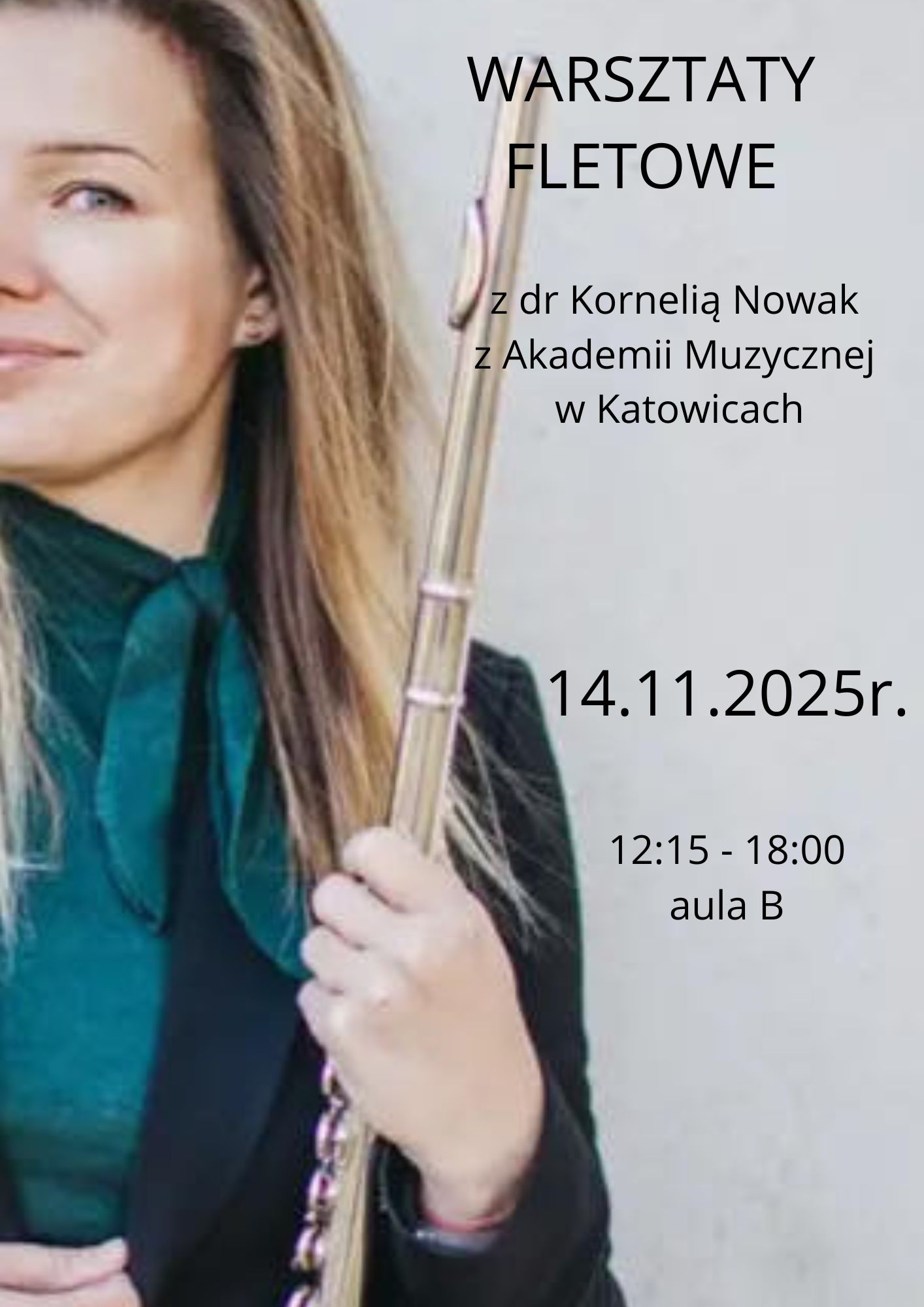 Zapraszamy na warsztaty fletowe, które poprowadzi dr Kornelia Nowak z Akademii Muzycznej w Katowicach. Warsztaty odbędą się 14 listopada 2025 r. w godzinach 12.15 - 18:00 w auli szkoły przy ul. Kołłątaja 1.