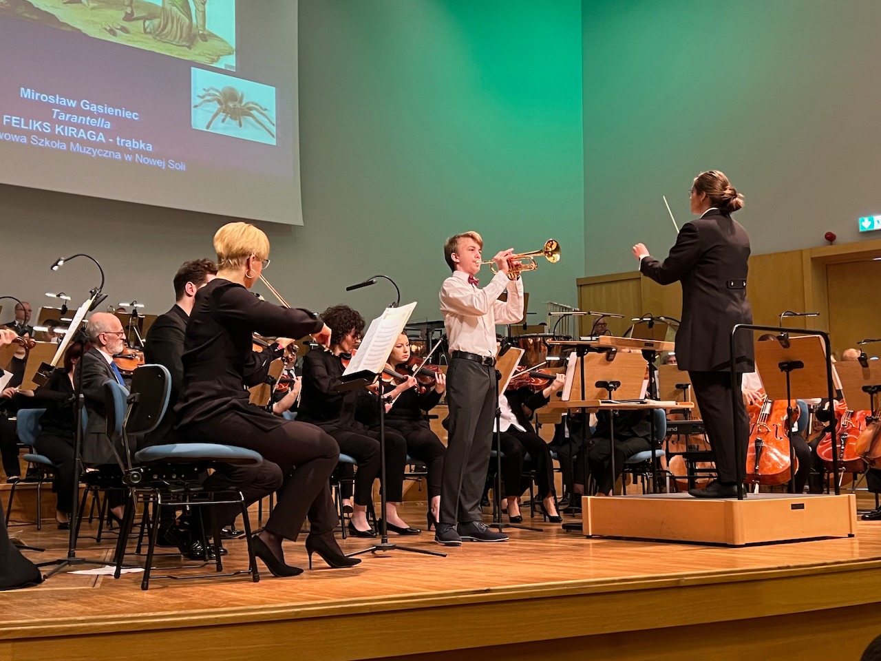 Od wielu lat Filharmonia Zielonogórska prowadzi koncerty edukacyjne dla młodzieży na które zaprasza młodych solistów - uczniów szkół muzycznych. 20 marca odbył się koncert na powitanie wiosny "Słoneczna Italia", a solistą był trębacz z naszej szkoły Feliks Kiraga. W wykonaniu Feliksa usłyszeliśmy "Tarantellę" Mirosława Gąsieńca w pomysłowym opracowaniu dyrektora Filharmonii - Rafała Kłoczko. Felek tak jak na konkursie w Oławie Tarantellę wykonał z pomysłem i lekkością za co został nagrodzony gromkimi brawami przez słuchaczy.