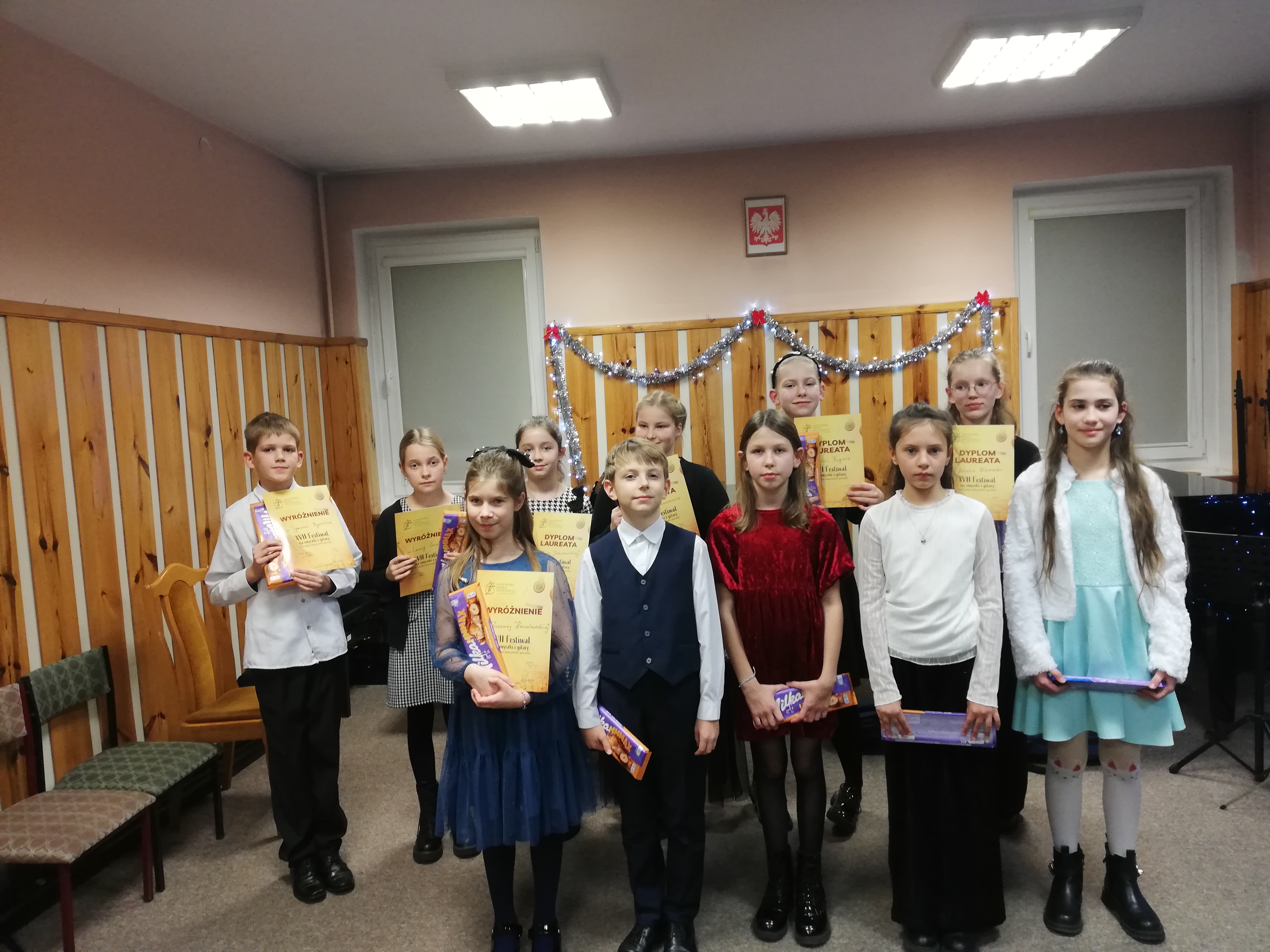 W dniu 11 grudnia 2024r odbył się w naszej Szkole XVII Festiwal na Smyczki i Gitarę. Wzięło w nim 16 uczniów z PSM I st. w Nowej Soli. Wszystkich uczestników Festiwalu oceniało Jury składające się z nauczycieli naszej Szkoły. W I grupie (klasa III i IV) było 11 uczestników. Z tej grupy Jury nagrodziło Dyplomem Laureata: Różę Jakubowską, Lenę Kanonowicz, Gabrielę Bogusz i Rozalin Werszko z kolei Dyplom Wyróżnienia Jury przyznało : Laurze Grocholskiej, Zuzannie Kowalewskiej i Tymonowi Bywalec. W grupie II (klasa V i VI) było 6 uczestników. Tutaj Jury wytypowało jednego kandydata do Dyplomu Laureata. Został nim Adam Witek.