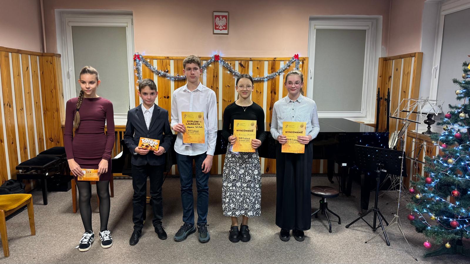 Dyplomy Wyróżnienia otrzymali: Aleksandra Szkoda i Katarzyna Mendaluk. Uczniowie którzy wywalczyli Dyplom Laureata otrzymali dodatkową Nagrodę- omija ich przesłuchanie półroczne. Z kolei Dyplom Wyróżnienia umożliwia grę na przesłuchaniu półrocznym tylko jednego utworu. Festiwal prowadziła Pani Agata Dąbrowska a całość przygotowała Pani Danuta Bylica. Gratuluję wszystkim uczestnikom Festiwalu sukcesu i życzę dalszych.