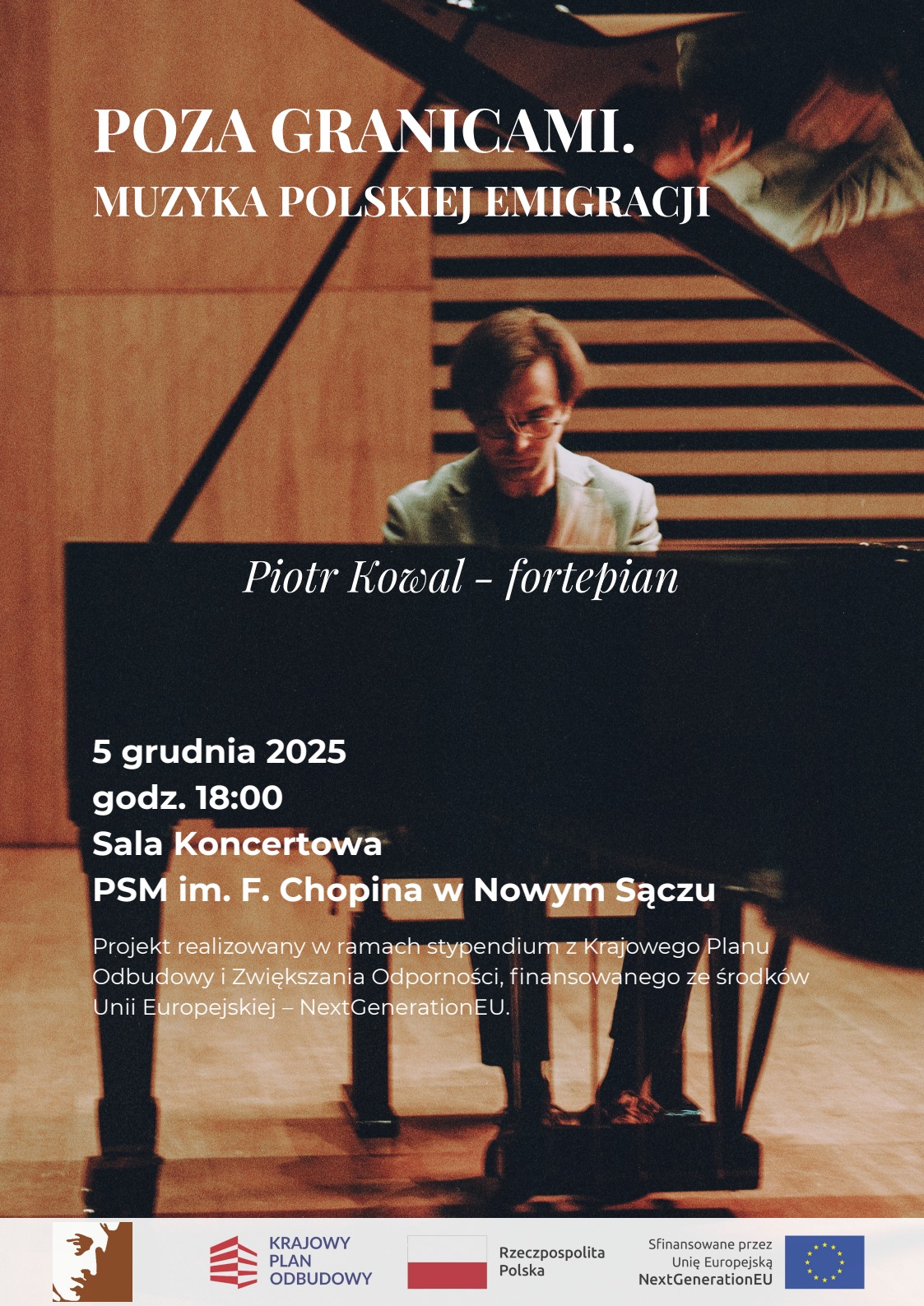 Już 5 grudnia o godz. 18.00 w Auli PSM odbędzie się koncert znakomitego pianisty - Piotra Kowala pt: "Poza granicami - muzyka polskiej emigracji". Wstęp wolny. Serdecznie zapraszamy!
