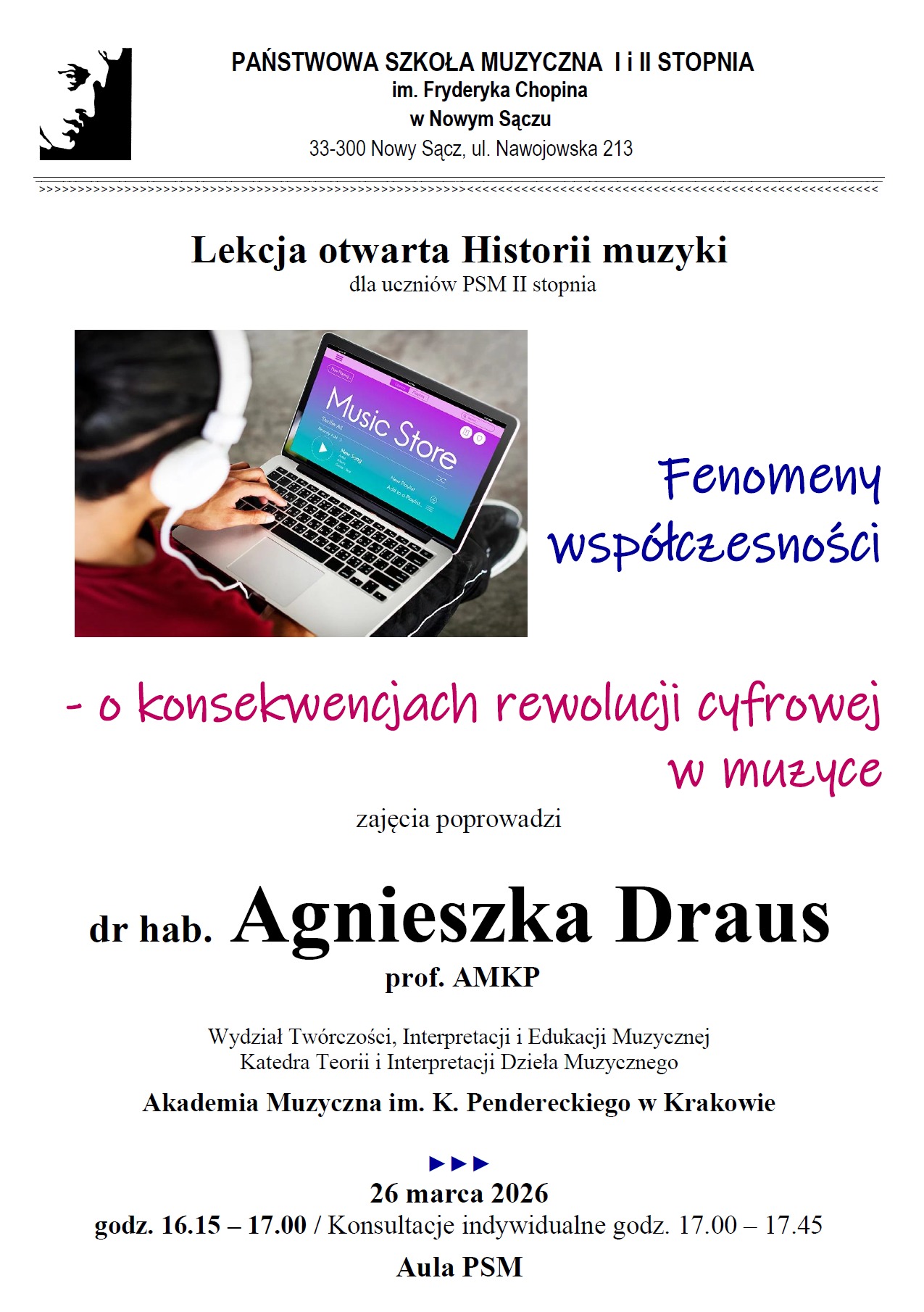 W czwartek 26 marca w naszej szkole odbyła się lekcja otwarta Historii muzyki, którą poprowadzi dr hab. Agnieszka Draus (AMKP w Krakowie).