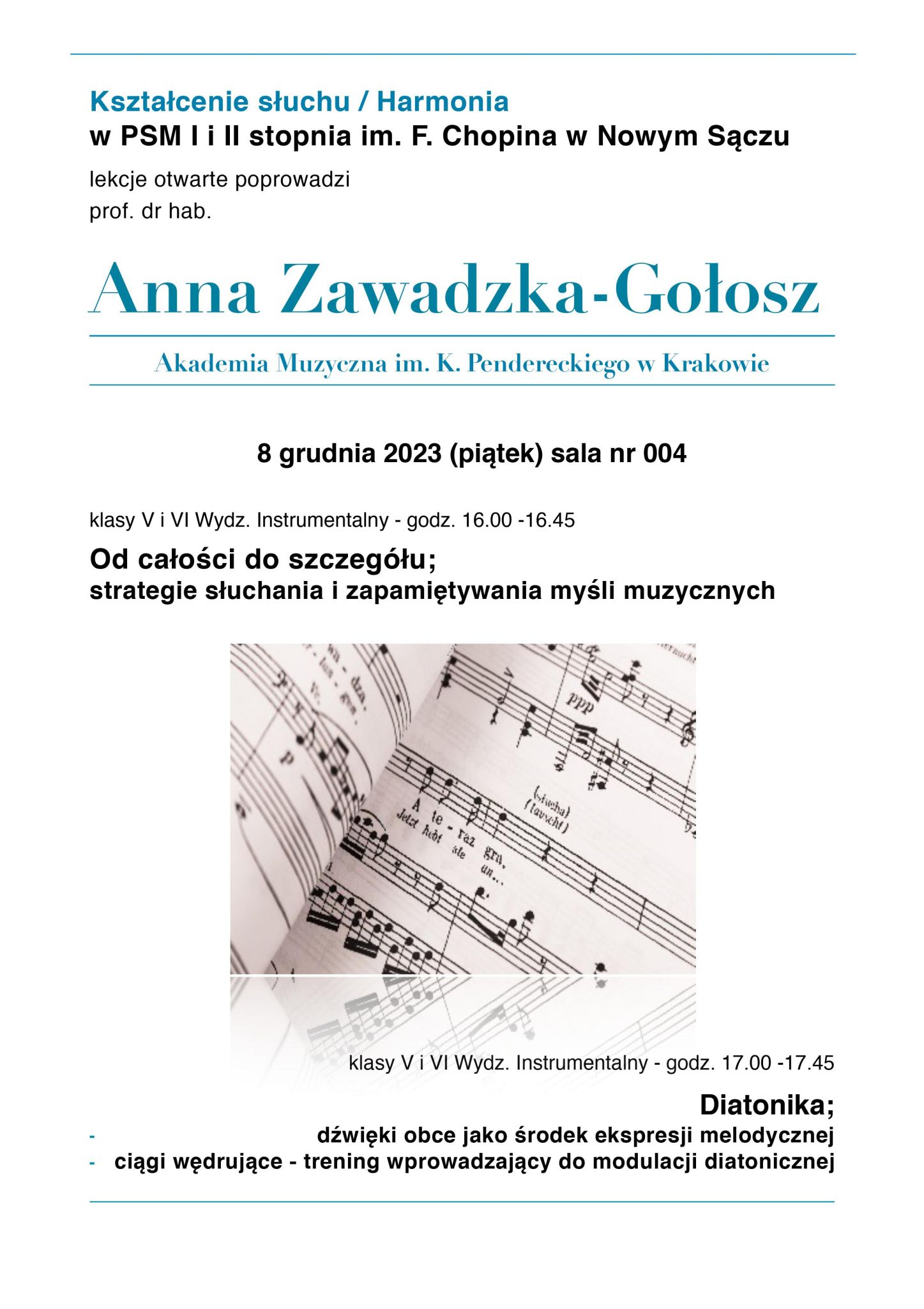 8. grudnia od godz. 13.00, w sali 004 PSM odbyło się spotkanie z prof. dr hab. Anną Zawadzką-Gołosz (AMKP w Krakowie). Jako pierwszy miał miejsce wykład otwarty dla pedagogów. W dalszej części odbyły się lekcje pokazowe Kształcenia słuchu i Harmonii w klasach V i VI szkoły II stopnia.