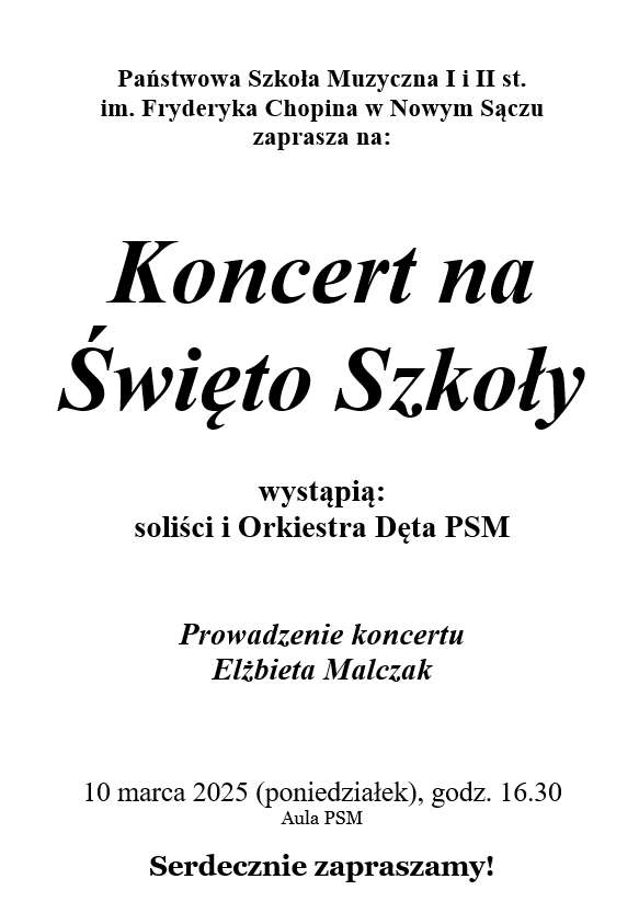 Serdecznie zapraszamy na Koncert na Święto Szkoły, który odbędzie się 10 marca 2025 roku o godz. 16.30 w Auli PSM. Wystąpią soliści i Orkiestra Dęta PSM. Koncert poprowadzi Elżbieta Malczak.