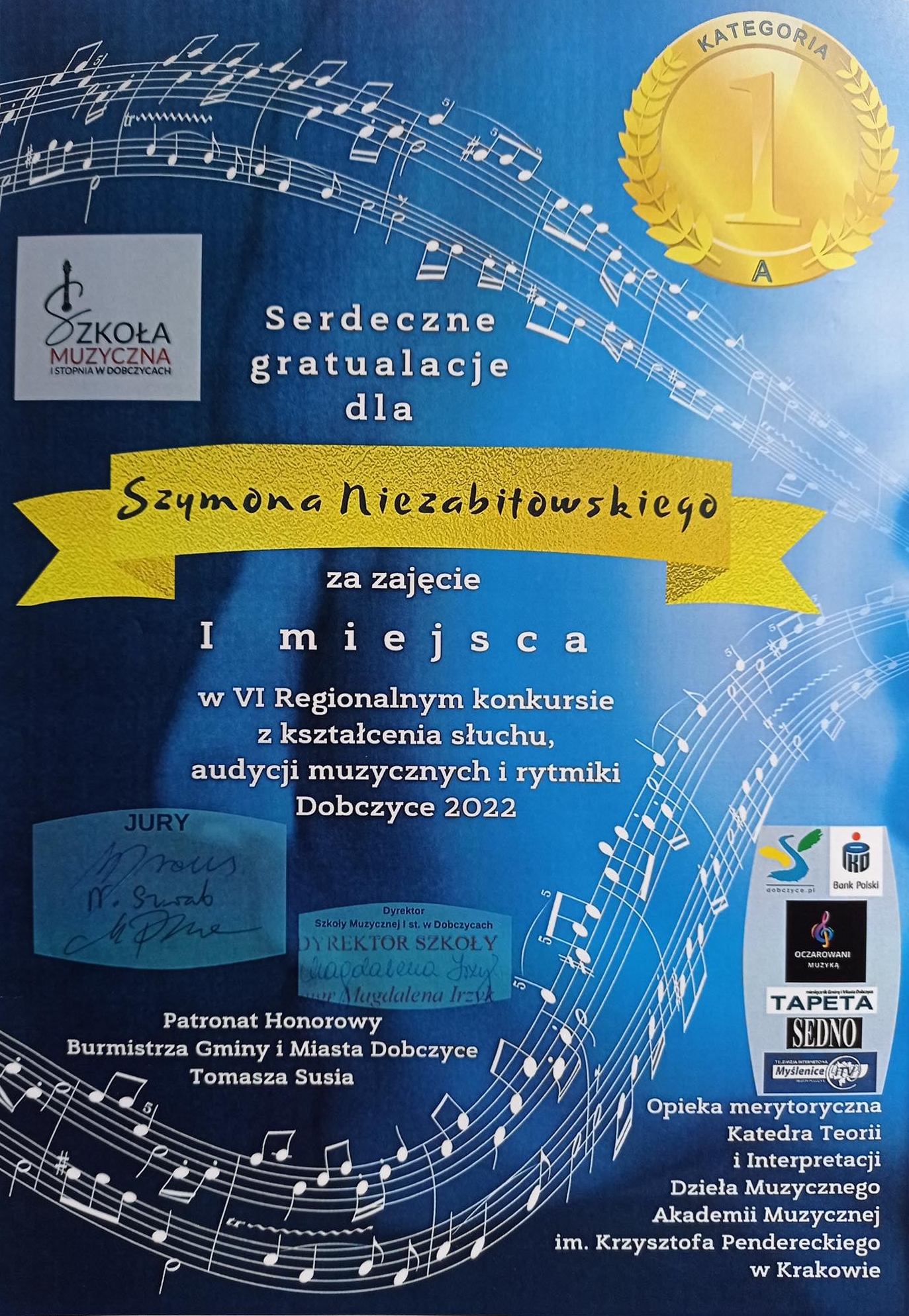 Szymon Niezabitowski zdobył I miejsce w VI Regionalnym konkursie z kształcenia słuchu, audycji muzycznych i rytmiki w Dobczycach.