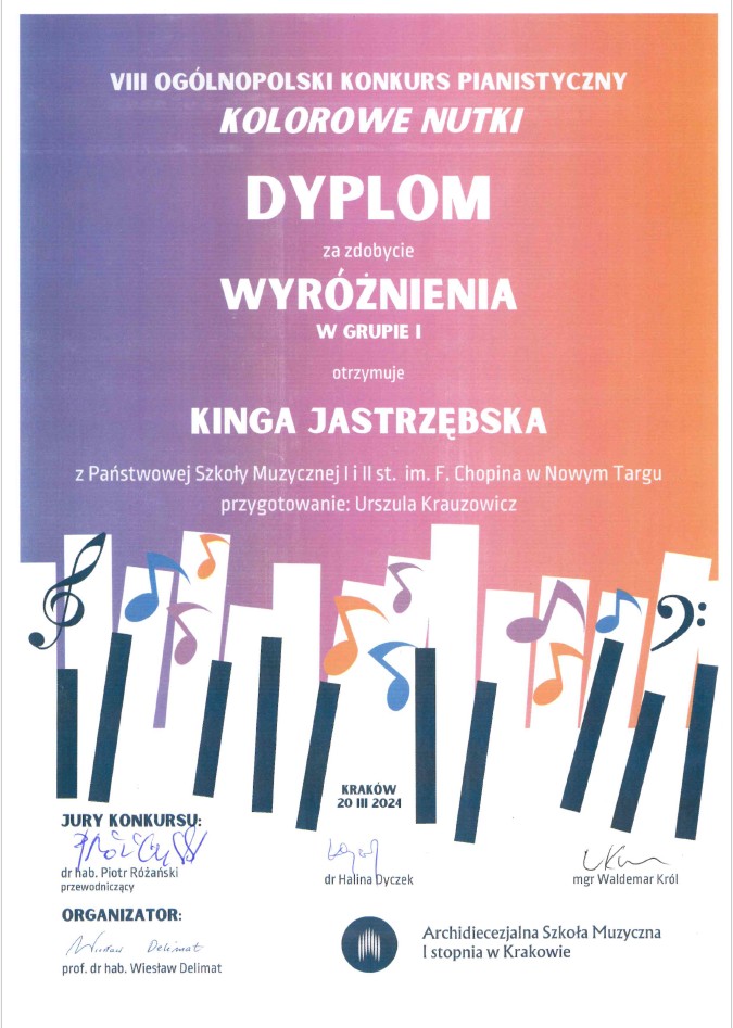 Z ogromną radością informujemy o osiagnięciach naszych pianistów podczas VIII Ogólnopolskiego Konkursu Pianistycznego dla dzieci i młodzieży „ Kolorowe nutki” (Kraków, 20 marca 2024 r.)