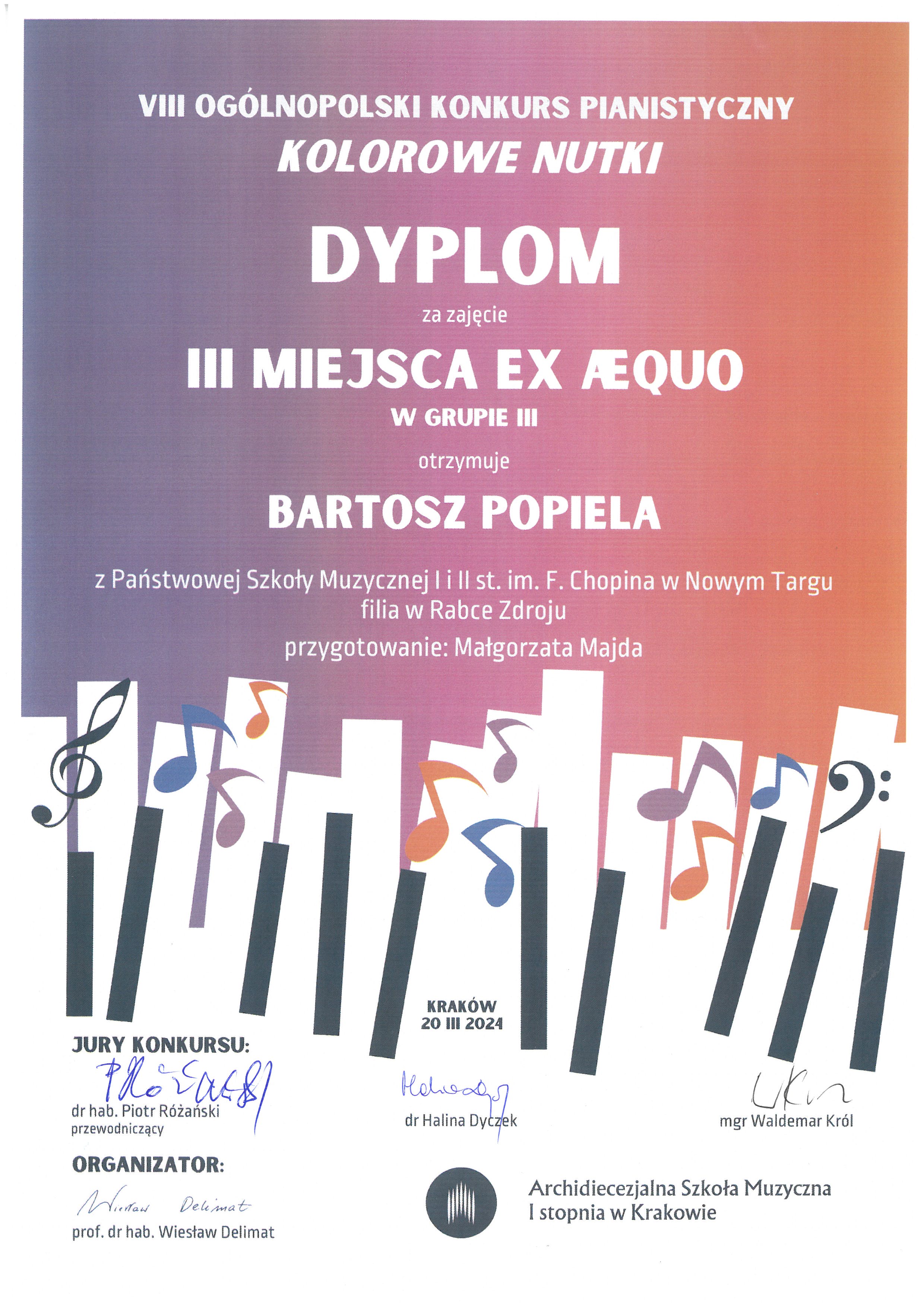 Bartosz Popiela uczeń z klasy fortepianu Pani Małgorzaty Majdy – III miejsce
