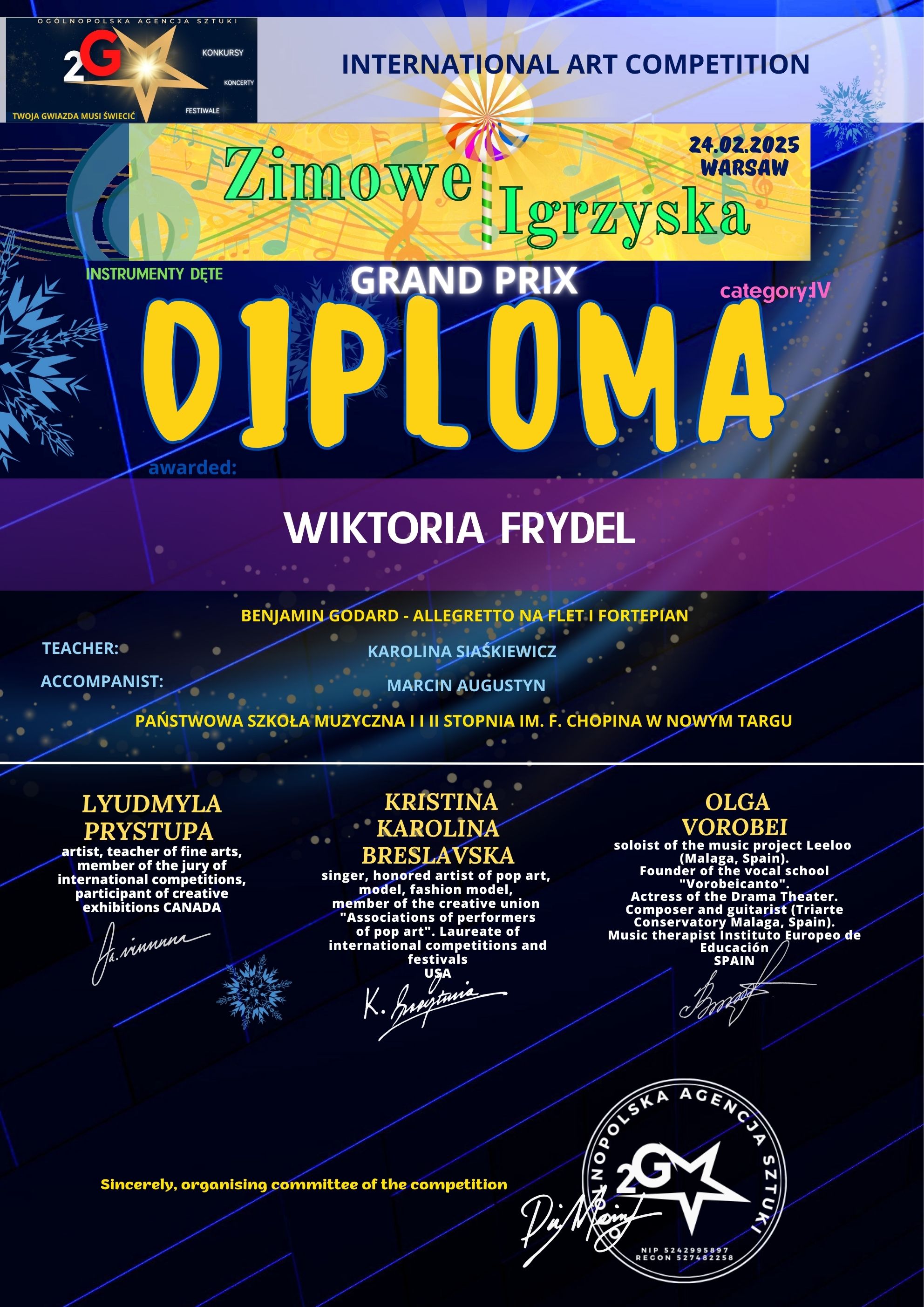 Z ogromną radością informujemy, że Wiktoria FRYDEL uczennica z klasy fletu Pani Karoliny SIAŚKIEWICZ zdobyła GRAND PRIX podczas międzynarodowego konkursu International Art Competition " Zimowe Igrzyska" w kategorii - Instrumenty Dęte.