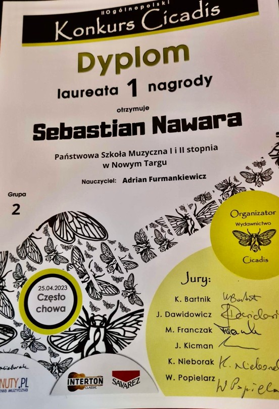 Niezwykle miłe wieści. Sebastian Nawara, uczeń z klasy gitary Pana Adriana Furmankiewicza zdobył Grand Prix (najwyższa punktacja spośród wszystkich uczestników konkursu) oraz jednocześnie I nagrodę w grupie 2 w II Ogólnopolskim Konkursie Gitarowym „Cicadis” w Częstochowie (25.04.2023r.). Nagroda Grand Prix to ufundowana przez firmę Interton Classic gitara klasyczna