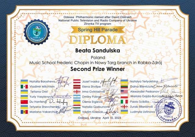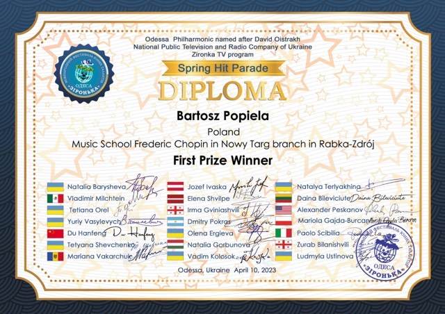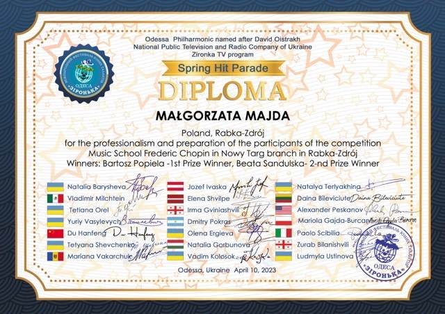 Pragniemy poinformować, że uczniowie klasy fortepianu Pani Małgorzaty Majdy osiągnęli sukces na międzynarodowym konkursie online "Spring Hit Parade - Odessa 2023".