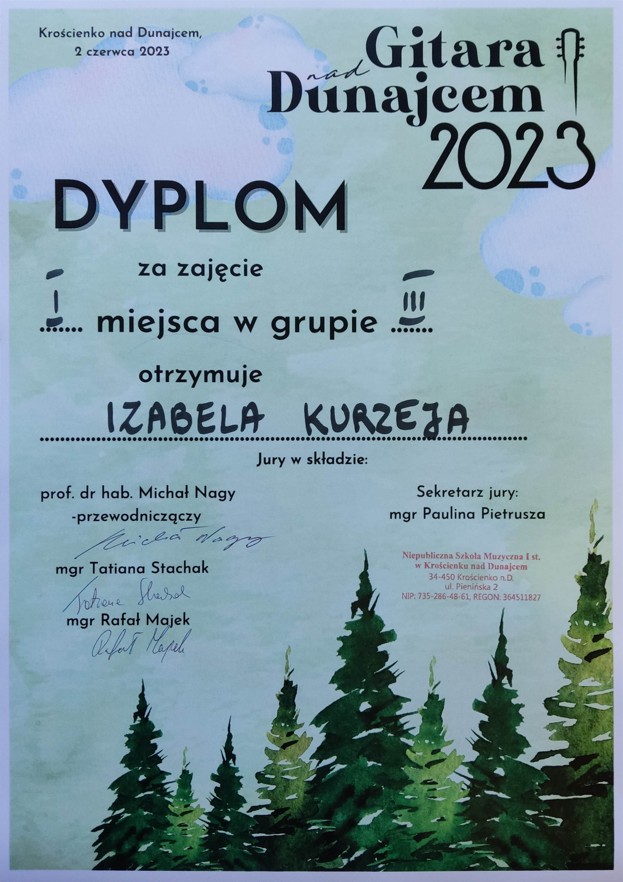 Bardzo miło nam poinformować, że Izabela Kurzeja uczennica z klasy gitary Pana Adriana Furmankiewicza zdobyła I nagrodę (1 miejsce) w grupie III podczas I Ogólnopolskiego Konkursu Gitarowego "Gitara nad Dunajcem" w Krościenku nad Dunajcem (02.06.2023 r.). Gratulujemy!!!