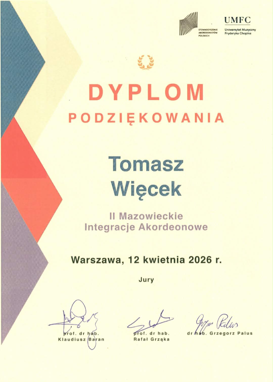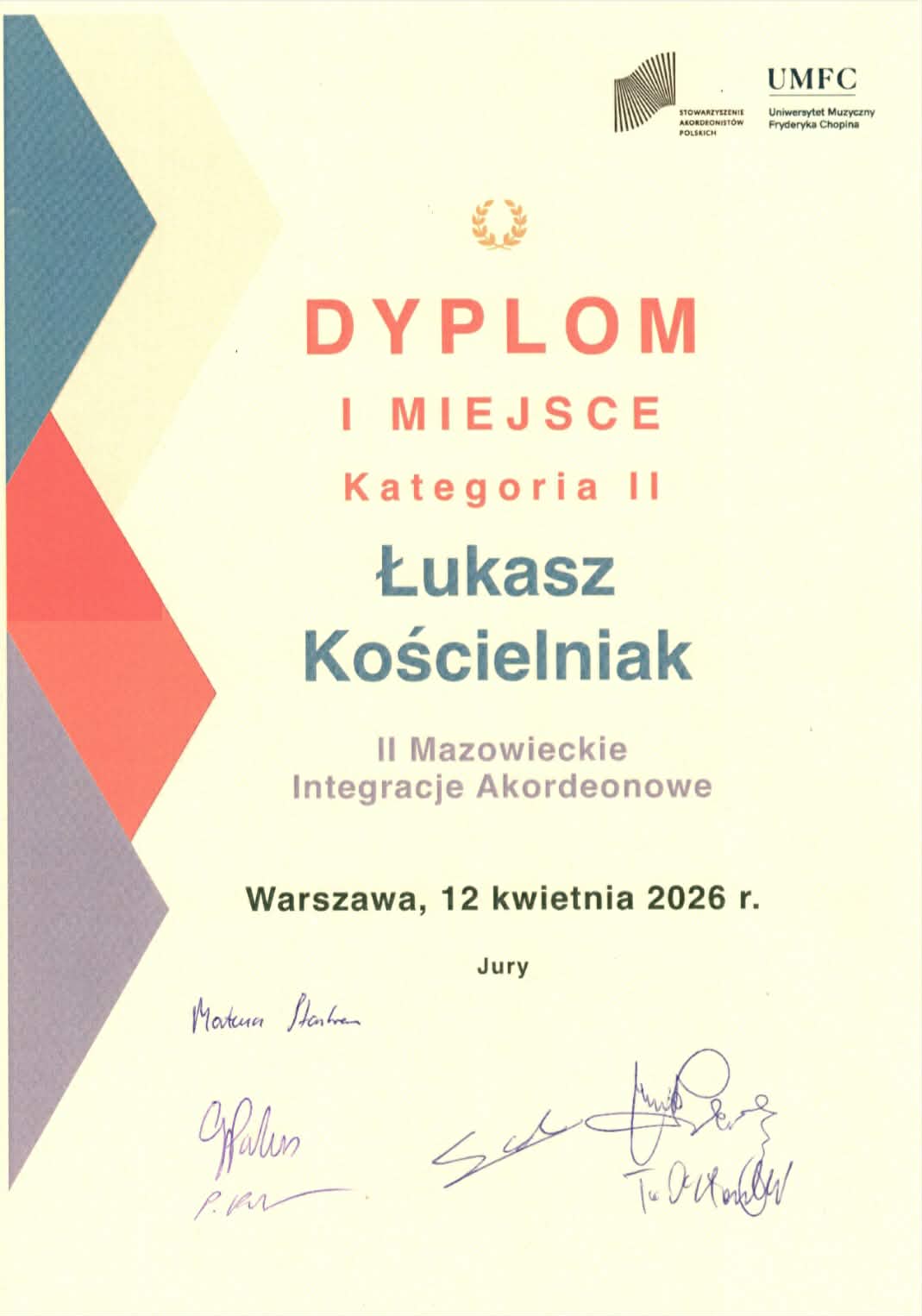 Z ogromną radością przyjęliśmy wiadomość o sukcesie Pana Łukasza Kościelniaka, który zdobył I miejsce (Kategoria II) podczas II Mazowieckich Integracji Akordeonowych w Warszawie.
