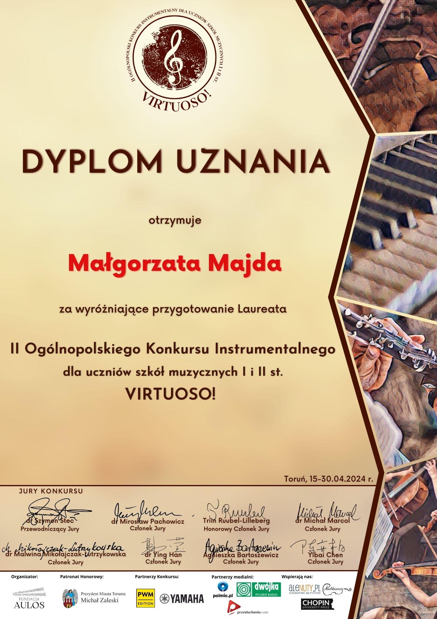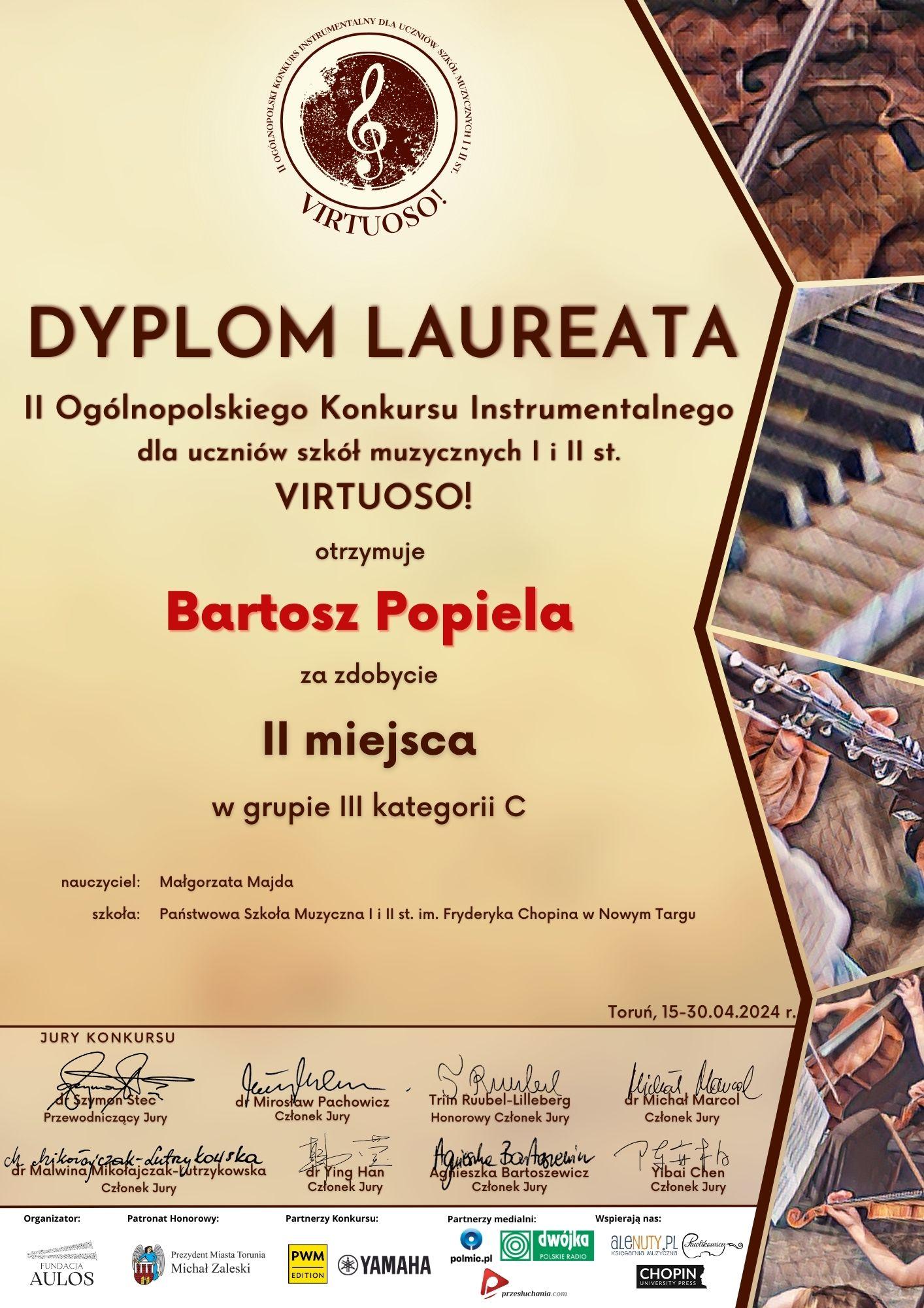 Informujemyz ogromną przyjemnością, że Bartosz Popiela uczeń klasy fortepianu Pani Małgorzaty Majdy zajął drugie miejsce w grupie III (uczniowie klas 5-6 cyklu 6- i 8-letniego szkół muzycznych I stopnia oraz klasy 3-4 cyklu 4-letniego szkół muzycznych I stopnia) kategoria C (fortepian) podczas II Ogólnopolskiego Konkursu Instrumentalnego dla uczniów szkół muzycznych I i II stopnia VIRTUOSO!, który odbył się w Toruniu dniach 15-30.04.2024 (edycja online).