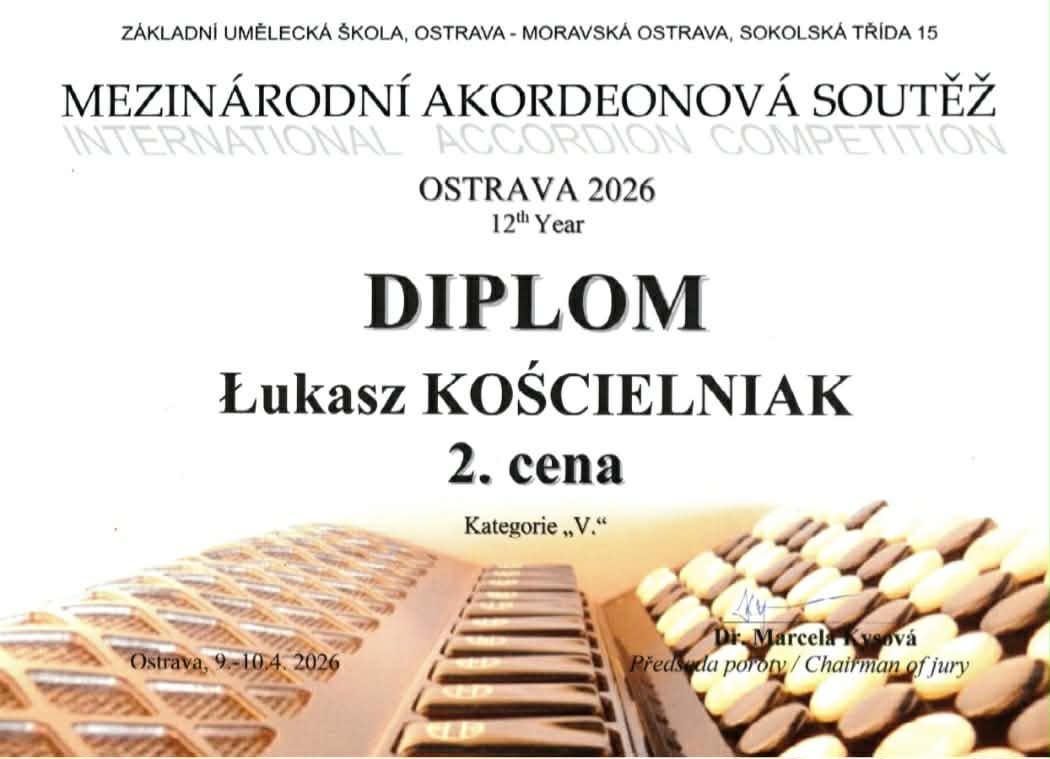 Z ogromną radością informujemy, że uczeń naszej szkoły, Łukasz Kościelniak, odniósł spektakularny sukces podczas 12. Międzynarodowego Konkursu Akordeonowego w Ostrawie (Czechy).