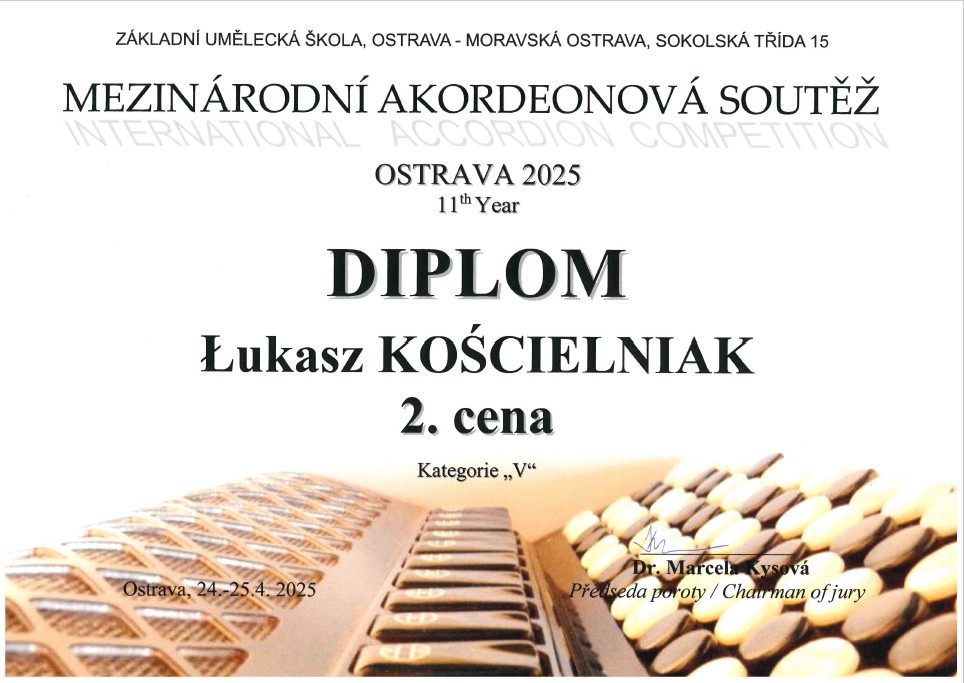 Z radością informujemy, że Łukasz Kościelniak, uczeń klasy akordeonu Pana Tomasza Więcka, zdobył II miejsce (I miejsca nie przyznano) podczas Międzynarodowego Konkursu Akordeonowego w Ostrawie!