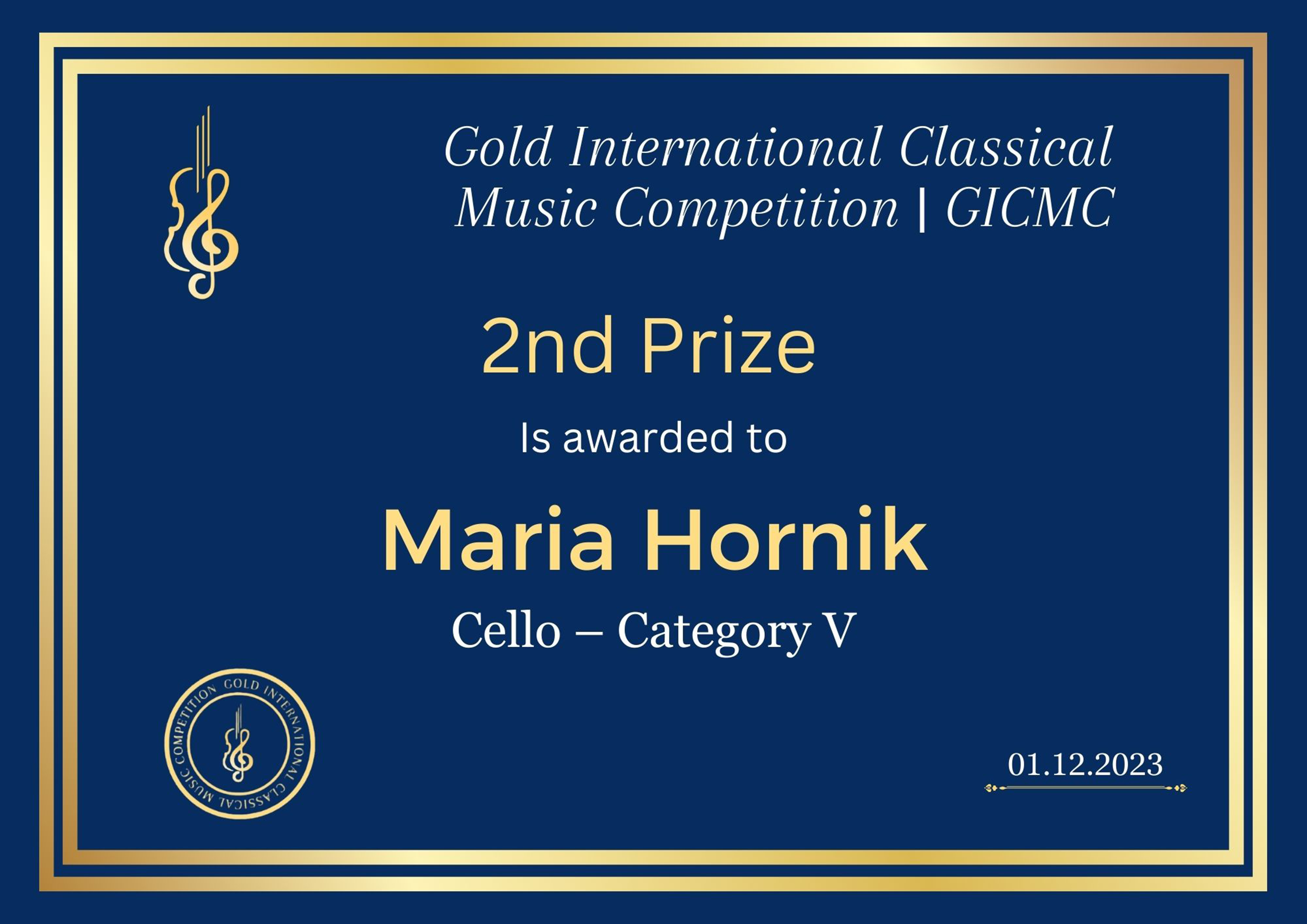Z radością informujemy, że Maria Hornik uczennica z klasy wiolonczeli Pani Moniki Gubały zajęła II miejsce podczas Gold International Classical Music Competition/GICMC (konkurs on-line) Wielka Brytania, 1 grudnia 2023 r.