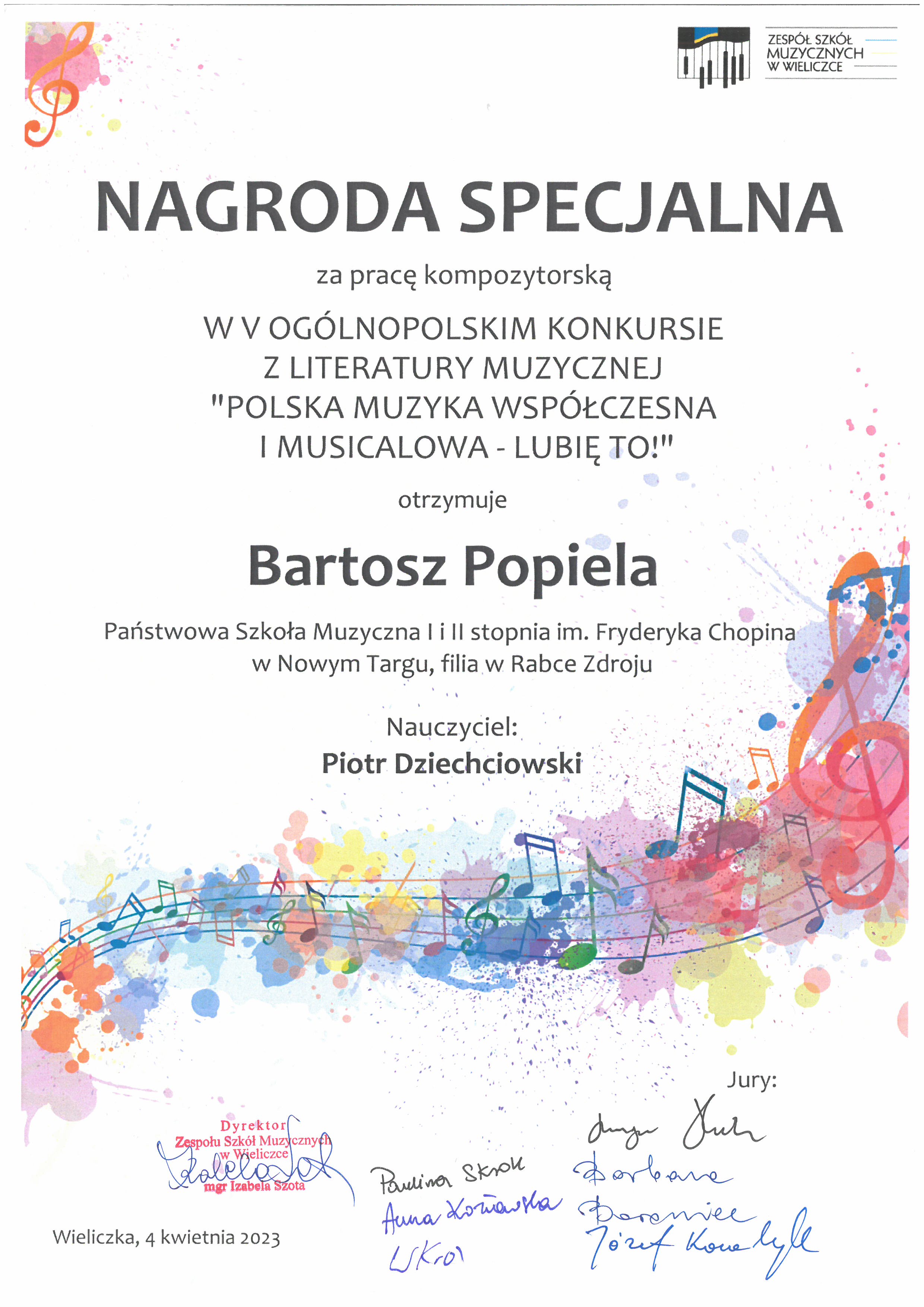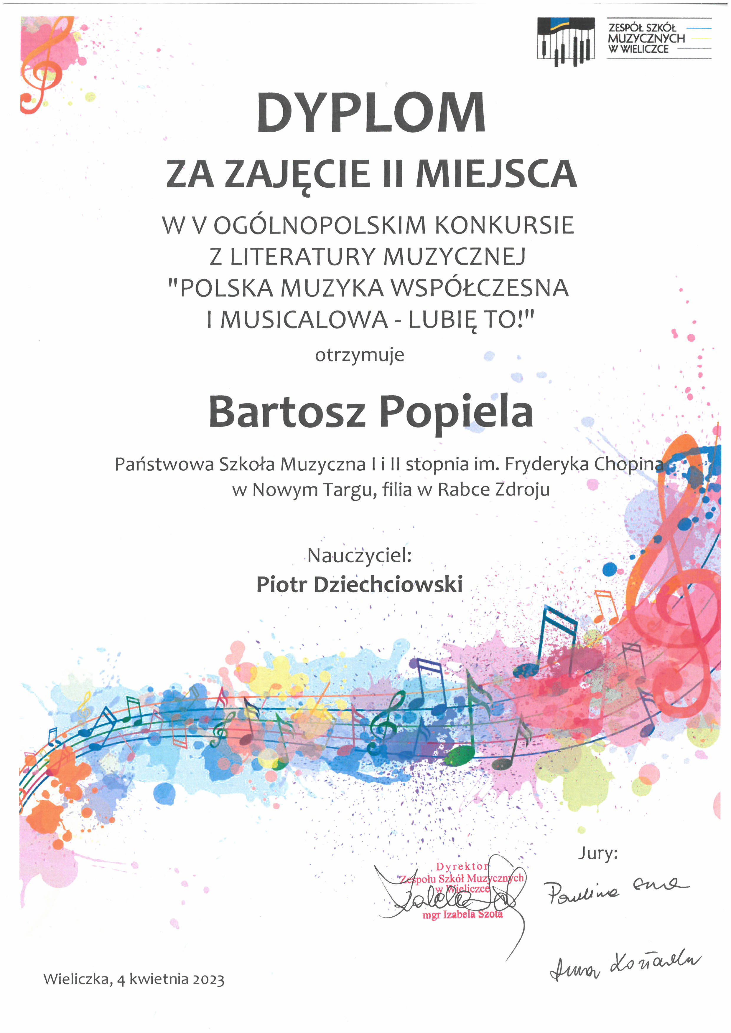 Z radością informujemy, że Bartosz Popiela, uczeń klasy teorii Pana Piotra Dziechciowskiego zajął II miejsce w V Ogólnopolskim Konkursie z literatury muzycznej "Polska muzyka współczesna i musicalowa – Lubię to!", który odbył się w Wieliczce 04 kwietnia 2023 roku.