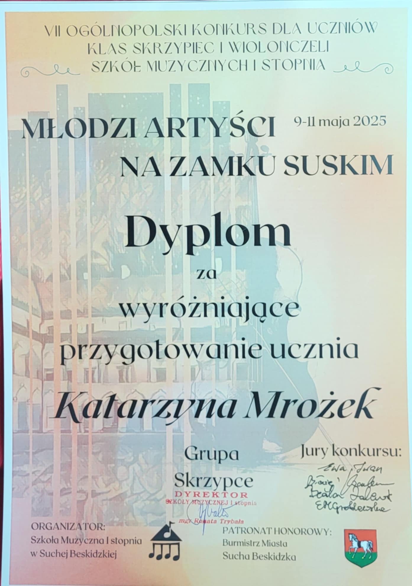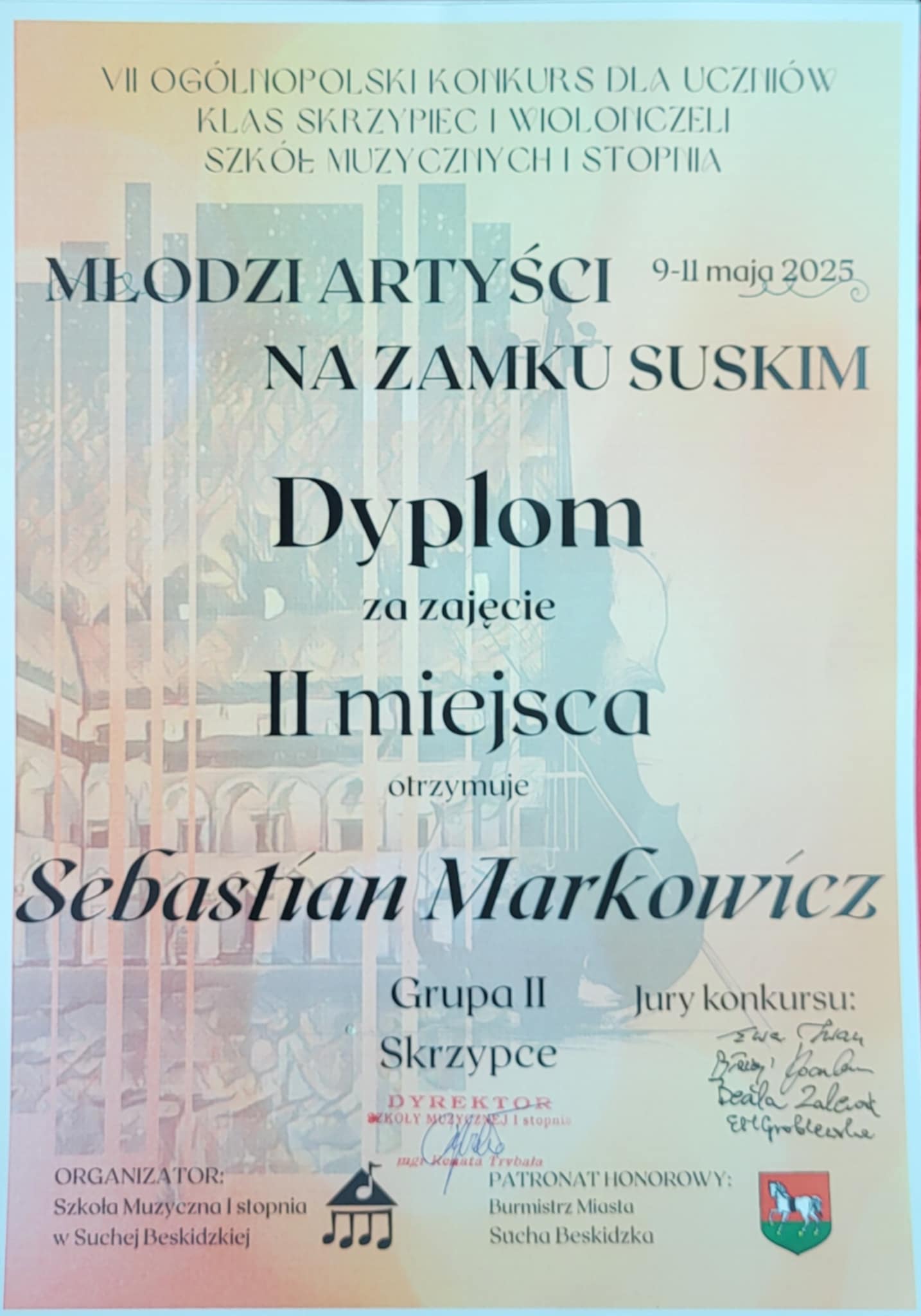 Z wielką radością informujemy, że Sebastian Markowicz – uczeń klasy skrzypiec Pani Katarzyny Mrożek – zdobył II miejsce na VII Ogólnopolskim Konkursie "Młodzi Artyści na Zamku Suskim" w Suchej Beskidzkiej!