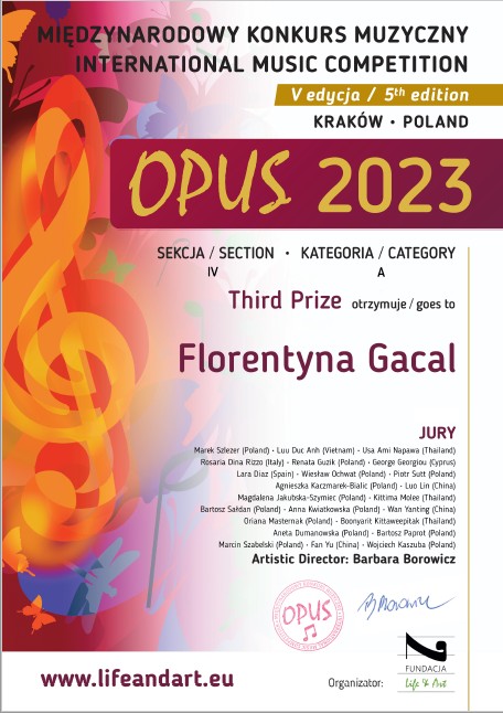 Miło nam poinformować, że Florentyna Gacal uczennica z klasy gitary Pani Jadwigi Wołek zajęła trzecie miejsce (ex aequo) w Międzynarodowym Konkursie Muzycznym OPUS 2023.