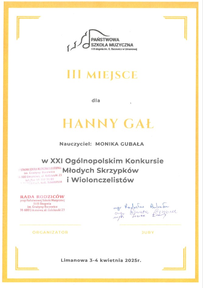 🎻HANNA GAŁ uczennica z klasy wiolonczeli Pani Moniki Gubały zdobyła III miejsce