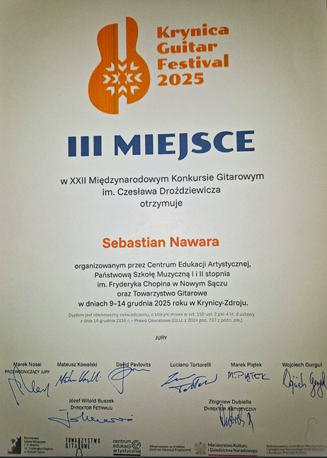 Sebastian Nawara, uczeń z klasy gitary Pana Adriana Furmankiewicza, zdobył III miejsce w grupie młodszej podczas XXII Międzynarodowego Konkursu Gitarowego im. Czesława Droździewicza w Krynicy-Zdroju, który odbywał się w dniach 9-14 grudnia 2025 r.