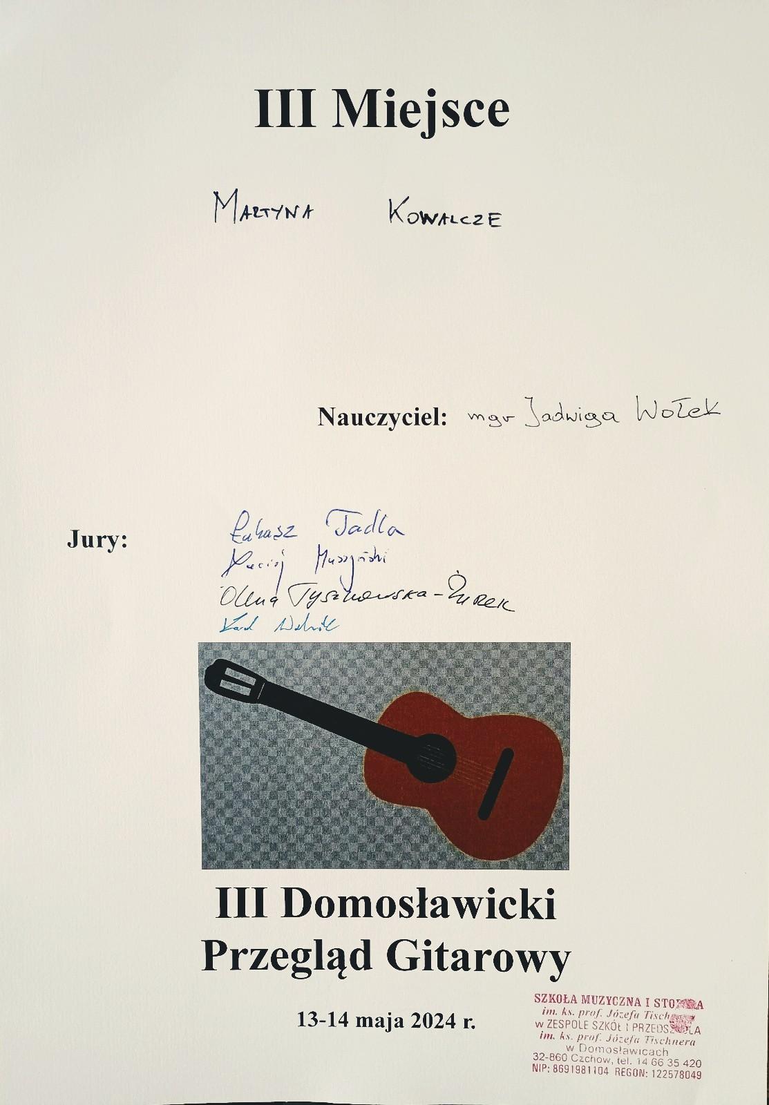 Śpieszymy donieść, że mamy świeżutki, konkursowy sukces uczennicy z klasy gitary Pani Jadwigi Wołek: Martyna Kowalcze z kl. III/6c w filii w Rabce- Zdroju zdobyła 3️⃣ miejsce na III Domosławickim Przeglądzie Gitarowym, który odbył się w Dworze Ignacego Jana Paderewskiego w Kąśnej Dolnej w dniach 13-14.05.2024r.